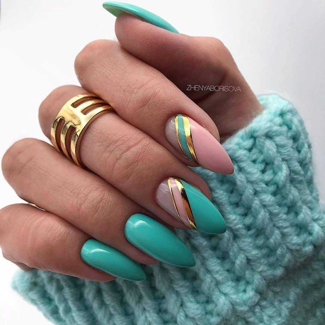 Фото мятного маникюра с золотом