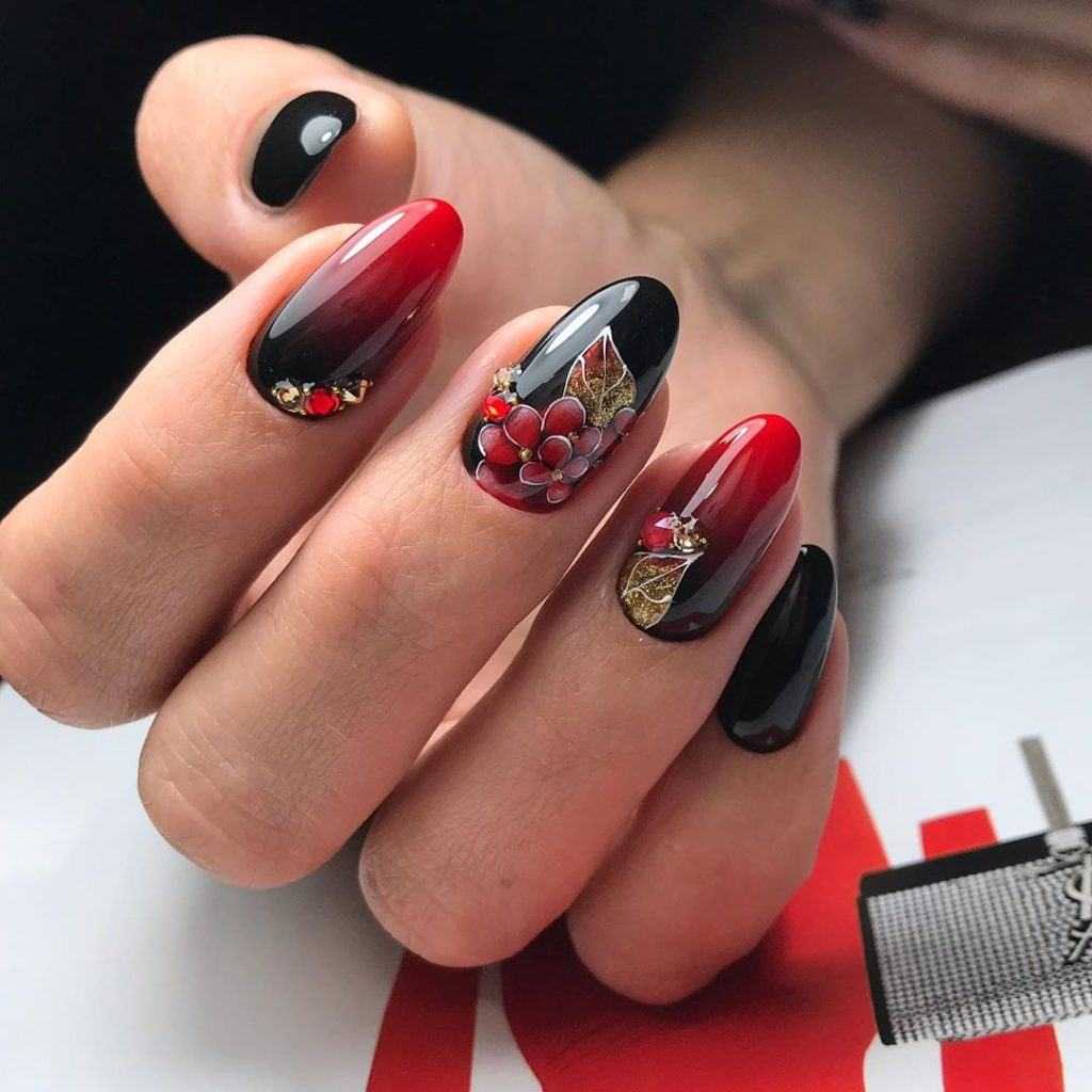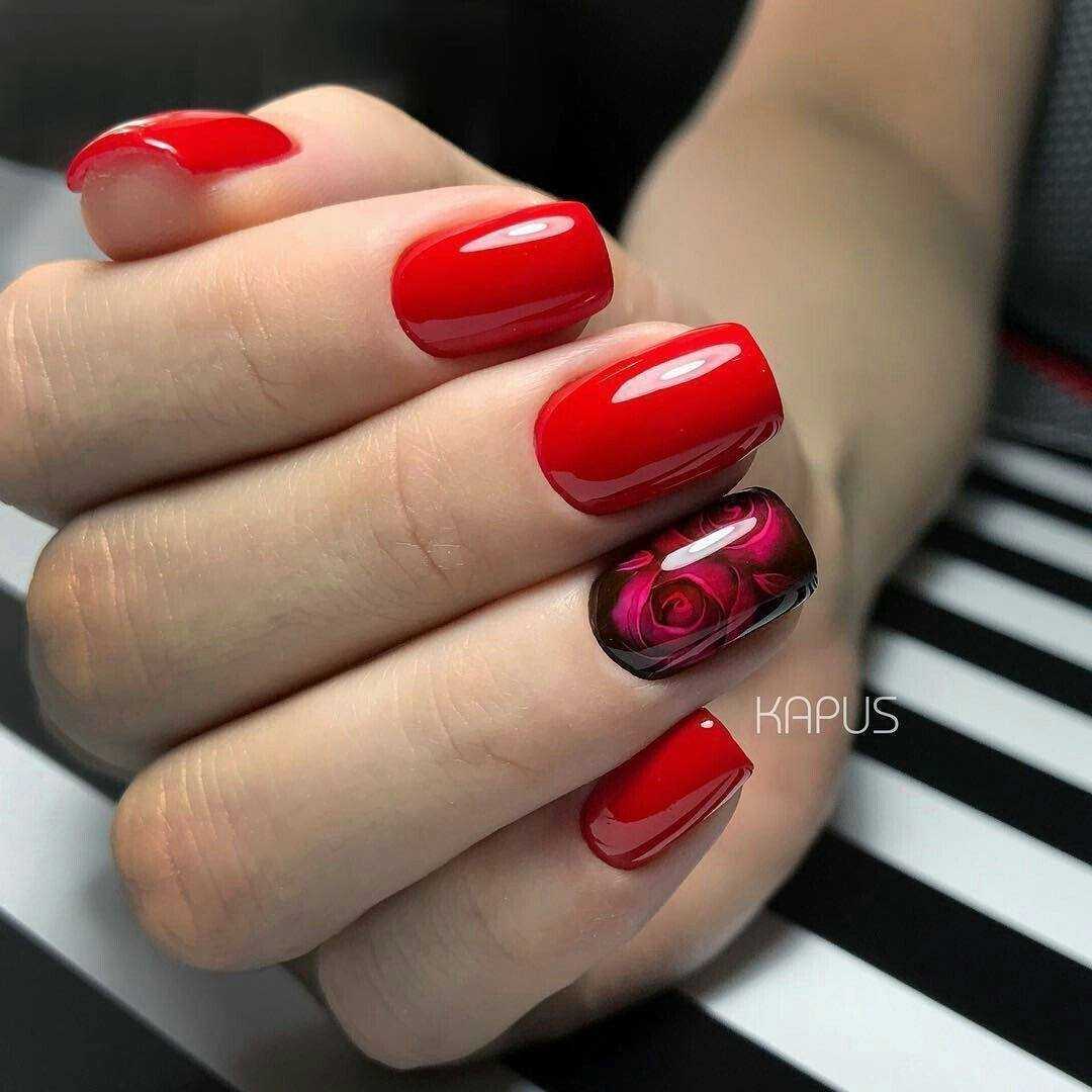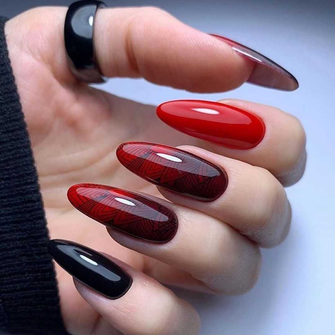Значит маникюр может быть выполнен в голубом и розовом цвете. Голубой сочетается с джинсами, розовый дополняет его и создаёт контраст, привлекающий взгляды. Для красного вечернего платья подойдёт контраст алого и чёрного. Алый подходит под наряд, чёрный придаёт дизайну изюминку. Не менее интересны варианты оформления в ахроматических цветах.