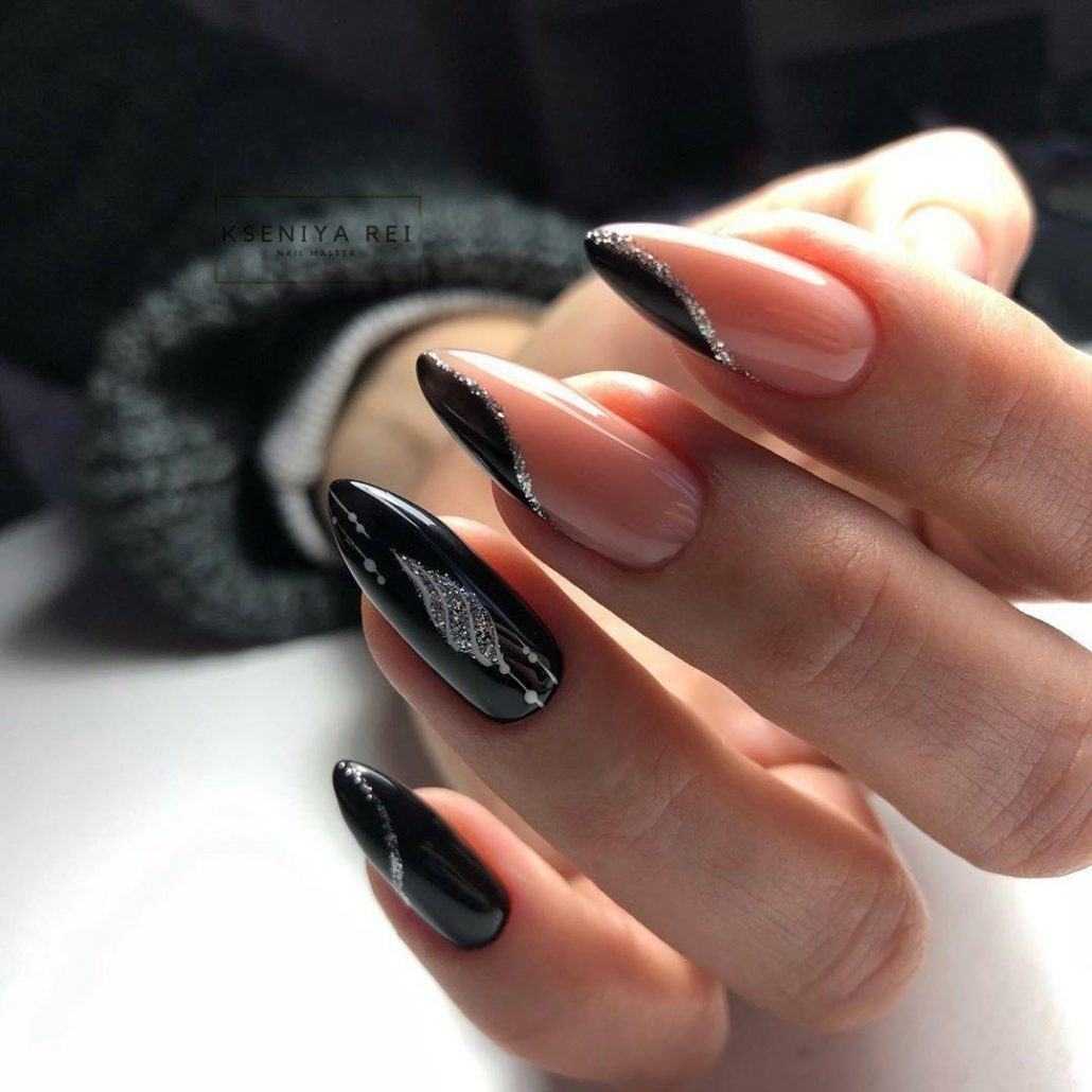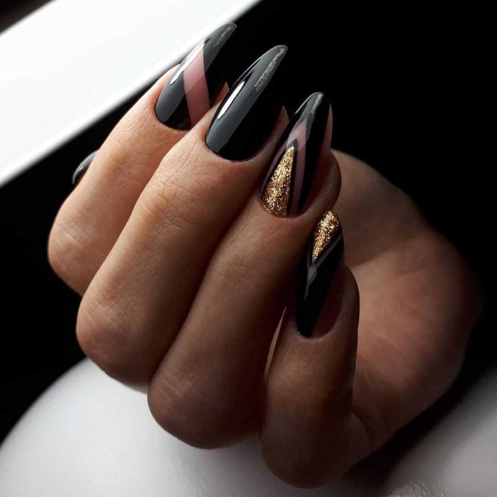 Блестящие покрытия красиво украшают ноготочки золотисто-коричневыми, медными, жёлтыми и всевозможными серебристыми переливами, которые хорошо смотрятся почти со всеми оттенками. Чёрный цвет считается универсальным и шикарно выступает дуэтом с покрытием любого оттенка.