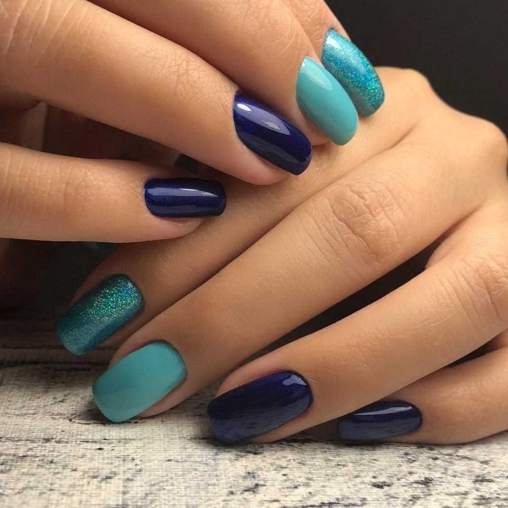 Синий цвет смотрится одинаково эффектно в глянце и в матовом исполнении. На ногтях разной длины результат может казаться по-разному: на коротких красивее светло-синий глянец или темный матовый лак, на длинных – наоборот.