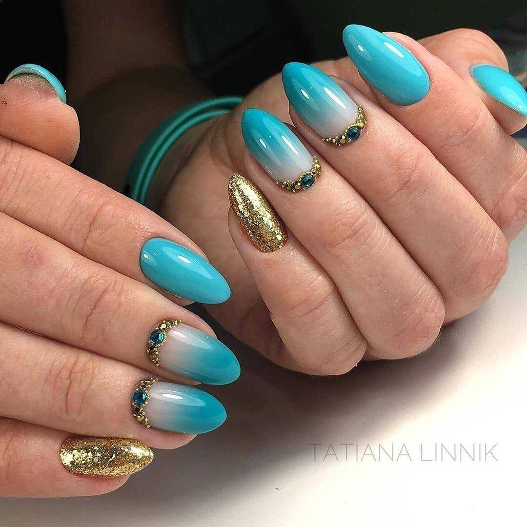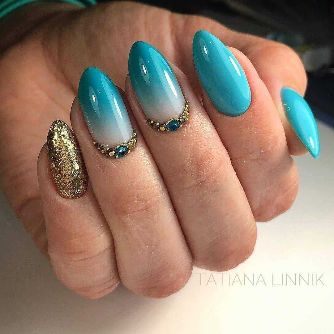 Плавный переход цвета от мизинца до большого пальца (омбре) или игра оттенка на одном ноготке могут быть только в синих тонах, но и с примесью другого оттенку. Пару к синему цвету можно выбрать любую. В тренде делать переходы цвета не на всех пальцах, а нескольких.