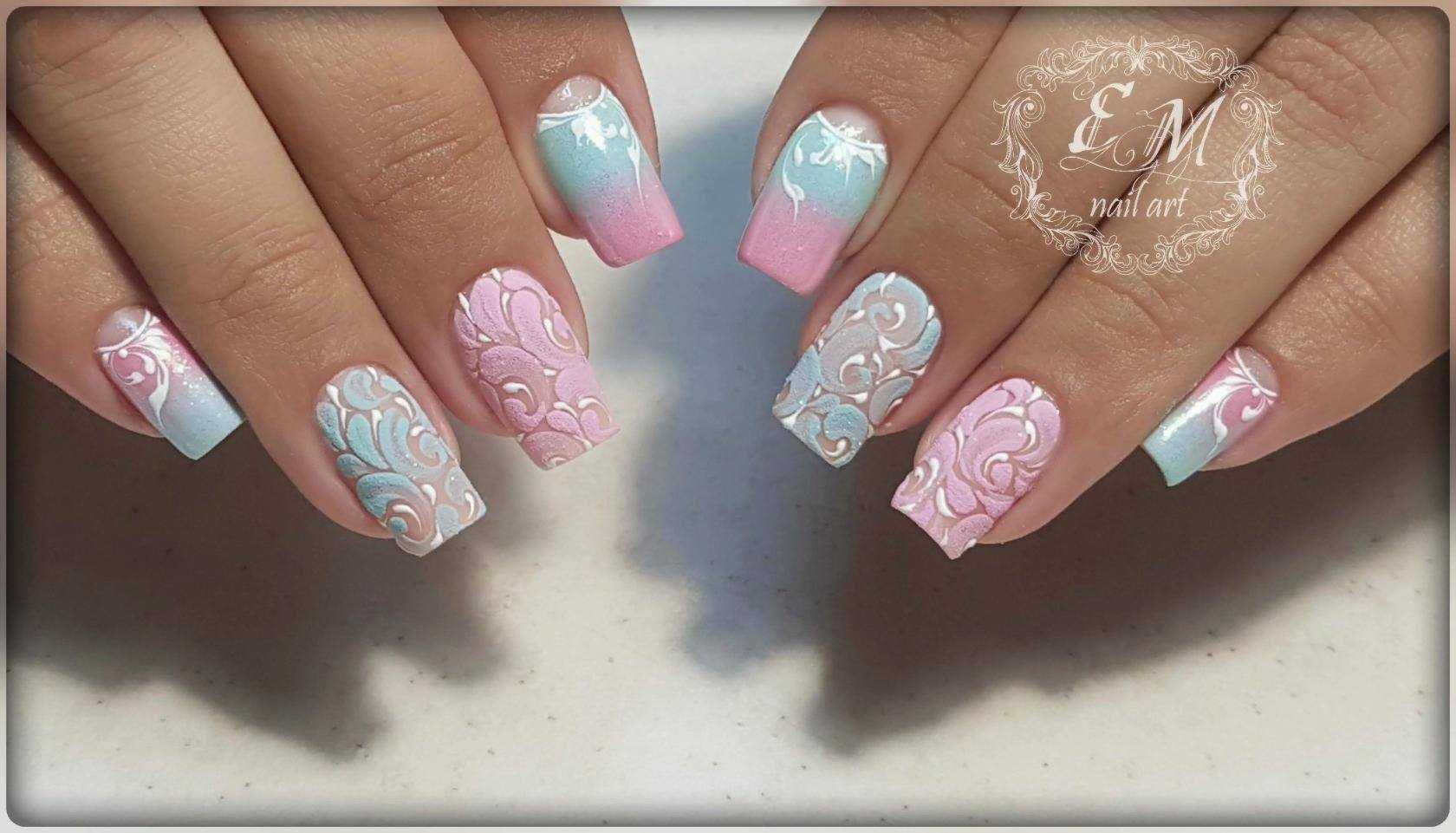 Мятно-розовый нежный градиент, цветочный принт и розовая пастель в маникюре выглядят необыкновенно женственно и романтично.