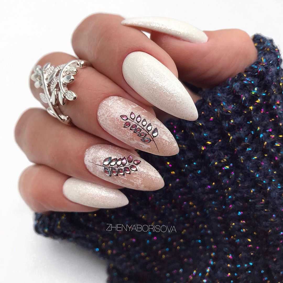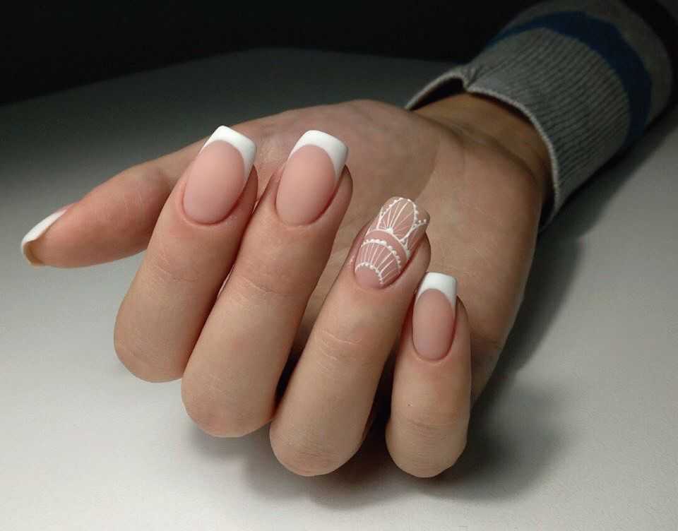 Такой маникюр — фаворит невест. Сочетание нюда и белого идеально дополняет свадебное платье. Белый френч с рисунком на одном пальце выглядит очень трогательно. Отдельного внимания заслуживает рисунок: чтобы повторить его в домашних условиях, понадобится трафарет.