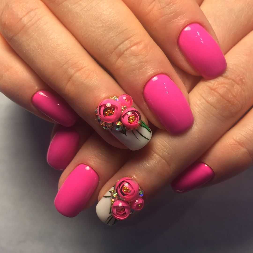 Романтичного настроения маникюру добавит цветочный дизайн. Его можно делать в розовых тонах на покрытии другого цвета, создавать цветочные узоры на розовом фоне. Цветочный дизайн можно создать росписью, стемпингом, наклейками, аппликацией. Стиль оформления может быть разным: