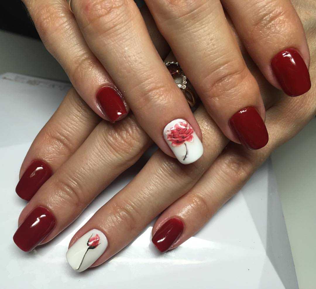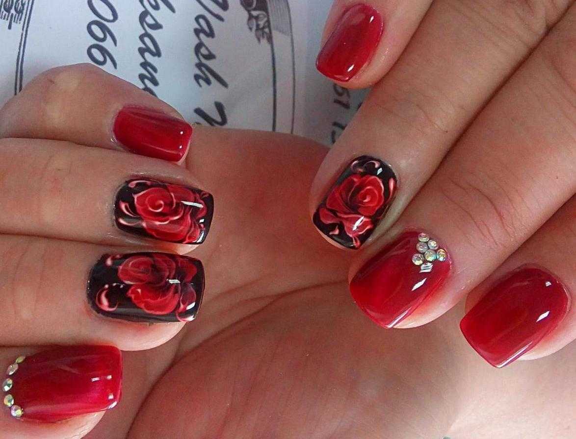 - красные розы – символизируют яркость, уверенность, страсть и любовь. Любой оттенок красного разнообразит ваш маникюр, сделает его более заметным. Психологи считают, что красные розы олицетворяют уверенную в себе женщину. Маникюр с красными розами станет лучшим решением если вы предпочитаете быть в центре внимания.