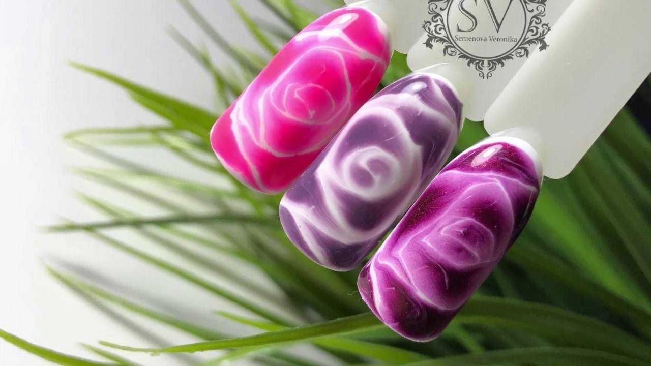 Акварельные изображения кажутся выполненными обычными красками на водной основе, настолько нежными и воздушными они выглядят. Но чаще используют гель-лаки, смешанные с топом, или специальные водорастворимые гели. Можно приготовить самодельное средство на палитре. Иногда удобнее нанести рисунок гель-лаками, а потом смоченной в топе кистью растушевать линии.