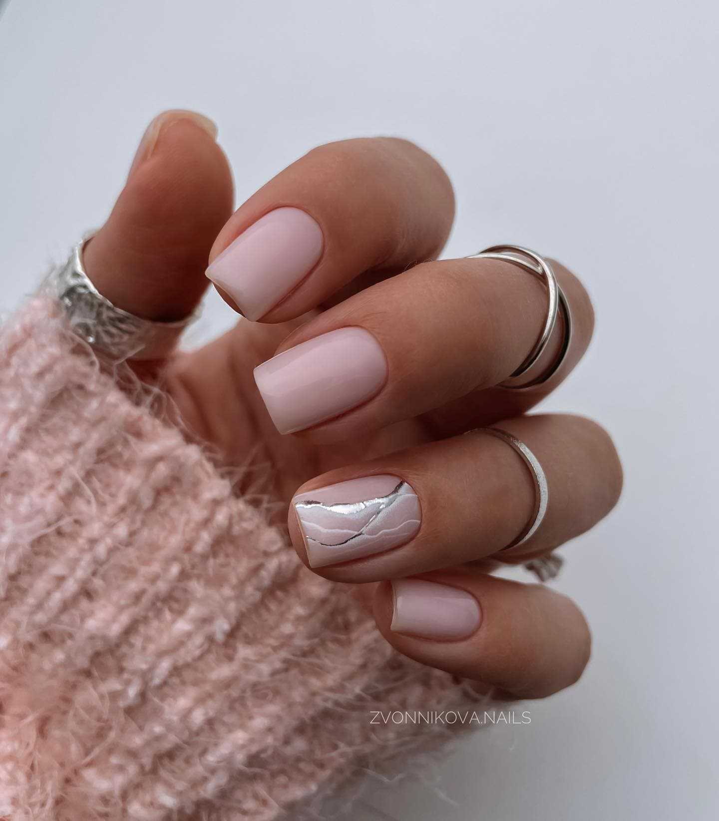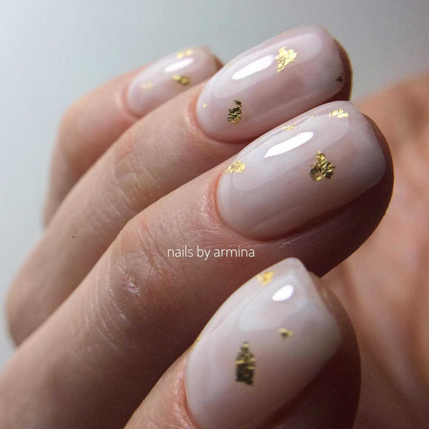 Хотя в этом маникюре присутствуют блестящие элементы в виде фольги, но они приглушены матовым топом. В качестве основы идеальный молочный гель-лак.