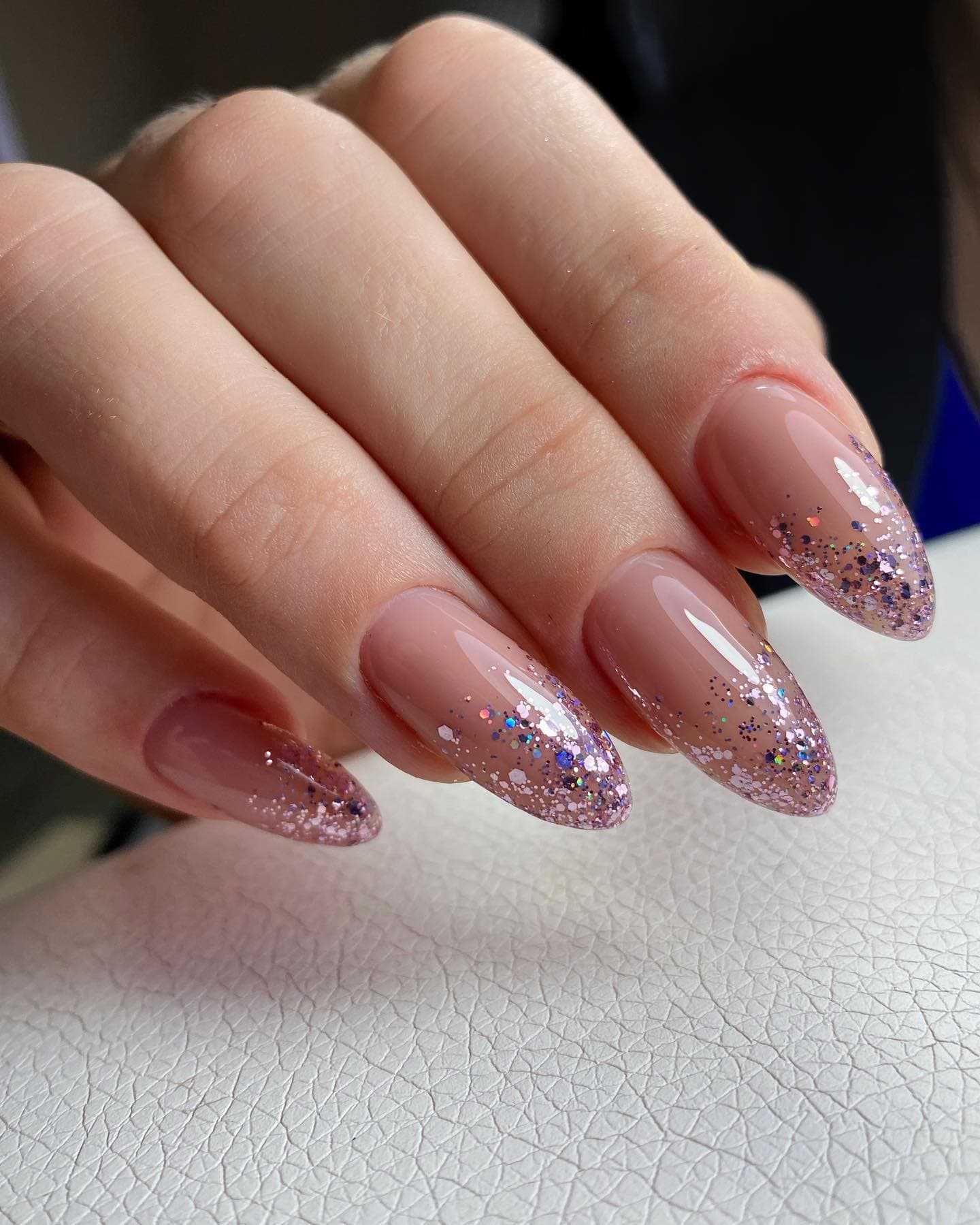 Категорически не подходит для маникюра в горошек совмещение разных текстур: битого стекла, фольги и т. п. А вот дизайн с блестками и пайетками — праздничный тренд 2022-2023.