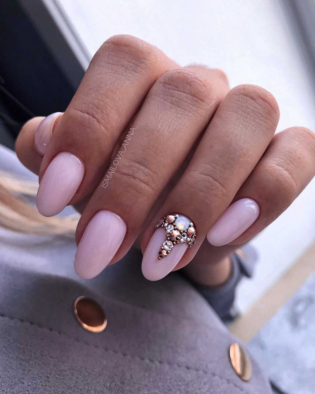Такой вариант относится к популярному стилю nude. Он лаконичен и прост в исполнении. Интересно будет смотреться игра фактур, когда на матовой основе рисуется рисунок похожего оттенка, но с глянцем. Более праздничная вариация включает в себя различные стразы, блестящие элементы. Конечно не обязательно ими усыпать все ногти, тем более это будет выглядеть безвкусно. Лучше сделать такие акценты на 1-2 пальчиках. Тем самым вы добавите пикантную нотку в нейтральный дизайн и при этом не утяжелите его.