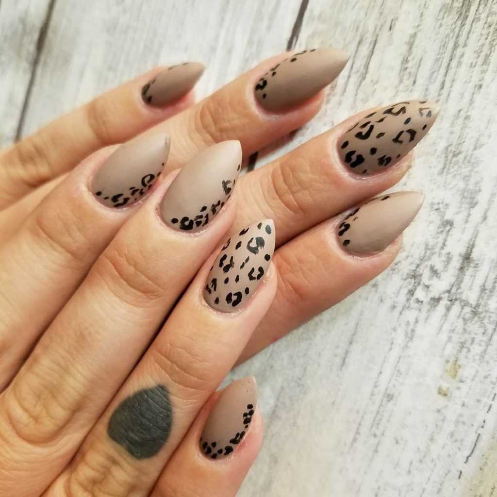 Беспроигрышным нейл-сочетанием может стать нюдовое или небесно-голубое покрытие и пятнышки, как у леопарда на одной половинке ногтя – вполне хищно, изящно, а также лаконично. Также в такой леопардовый дизайн ногтей можно внести изюминку в виде металлизированных полосок из декоративной фольги.