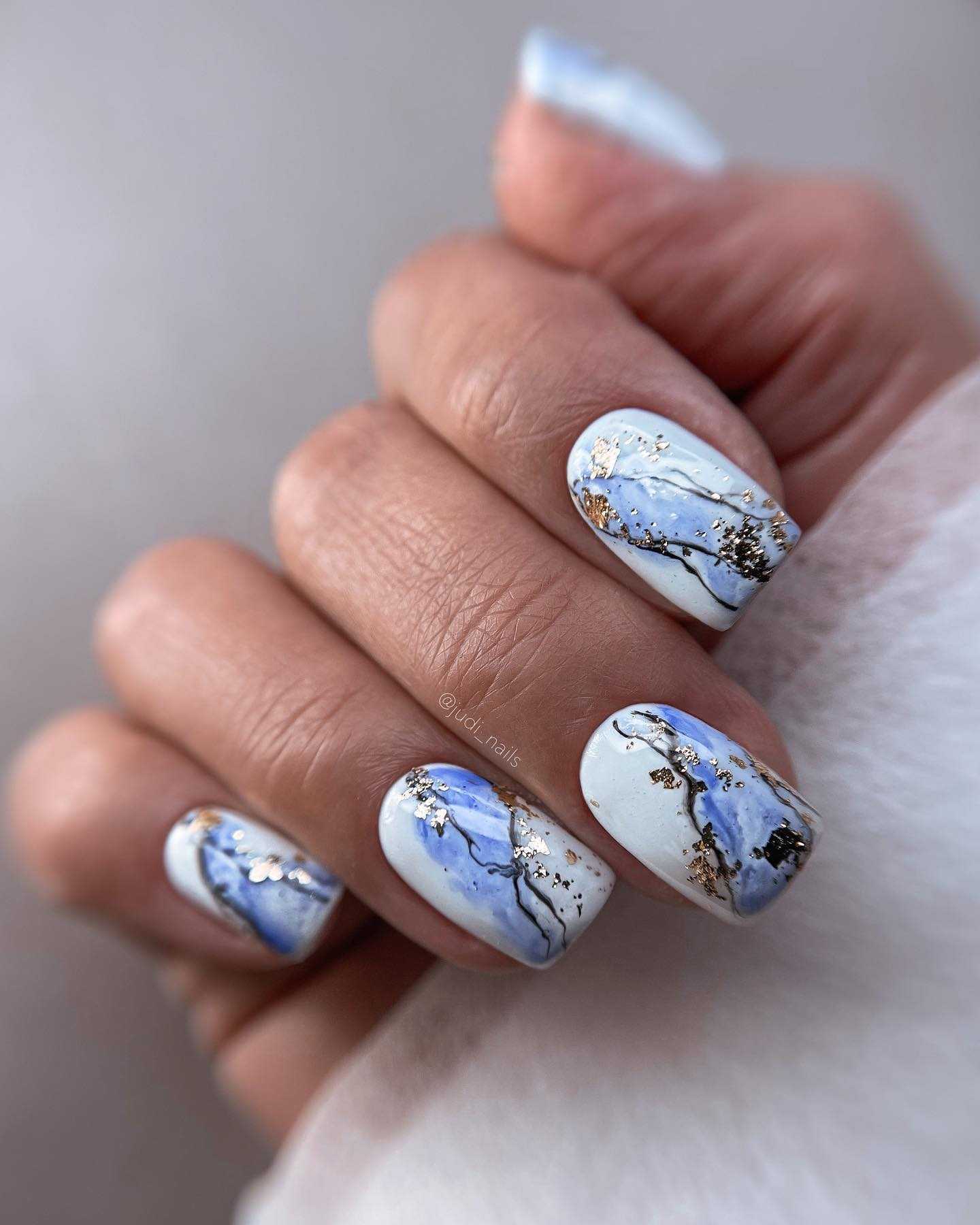 Или например, если на один из ногтей нанести рисунок под мрамор с вкраплением золота, а другой полностью покрыть золотым цветом.