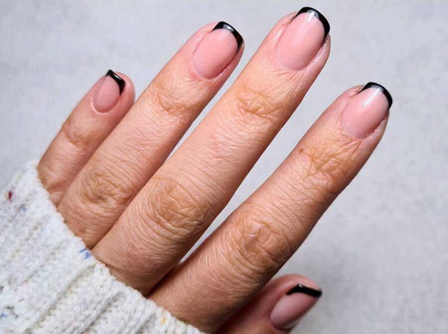 Длинная овальная форма ногтей позволяет расширить грани фантазии мастера нейл-арта. Нюдовый френч на контрасте с черным и добавлением блестков — это украшение рук любой женщины.