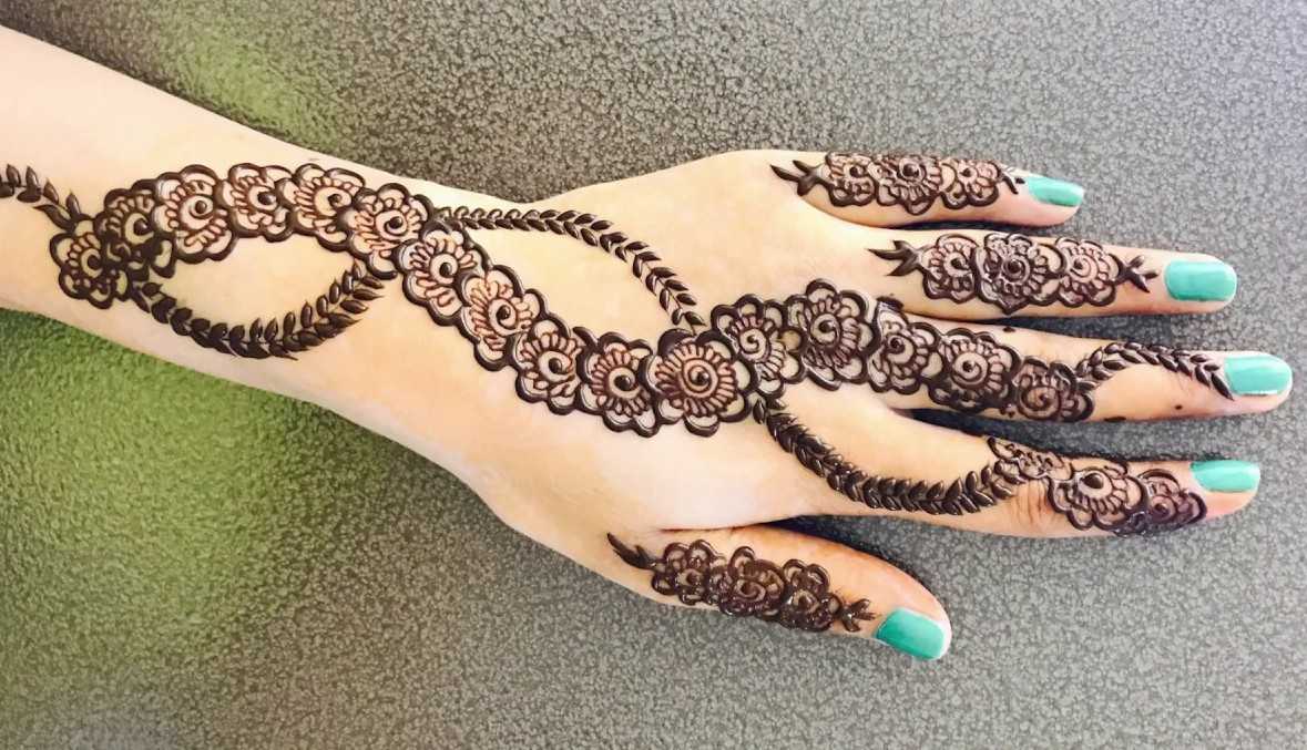 - Браслет. Нехитрый способ украсить запястье, который подойдет для начинающих любителей мехенди. Рисунок дополняют бантами, цветами, точками или каплевидными вкраплениями. Браслет — сильный оберег от неприятностей, усиливающий женскую энергию.