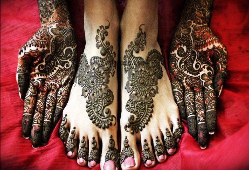 - Пакистанские и индийские умельцы не останавливаются только на ладонях и ступнях людей, выступающих в роли полотен. Они растягивают рисунки намного выше, тем самым создавая некое подобие чулок или перчаток, сотканных из их рисунков. Индийско-пакистанские мехенди сочетают в себе каплевидные рисунки, орнаменты и плавные линии