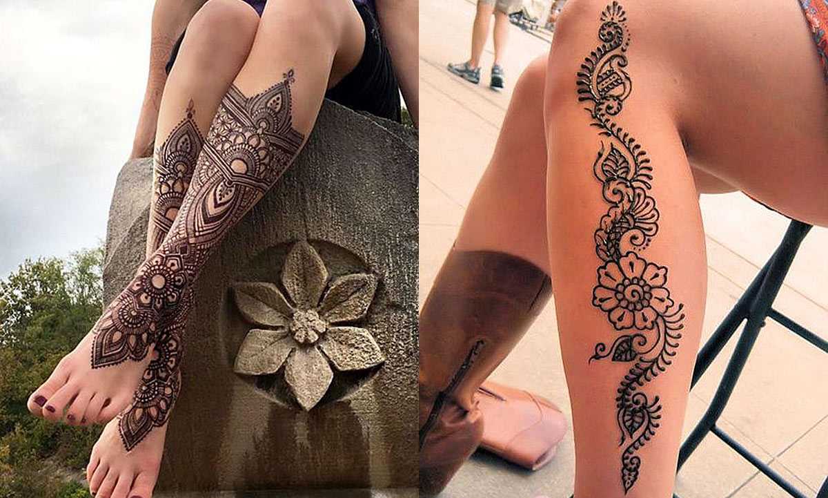 Если узоры занимают большую поверхность, напоминают браслет либо чулок, художник следовал индийской традиции. На ноге могут быть изображены птицы, животные, цветы, сакральные символы. Часто орнаменты выполняются 2 и более цветами.