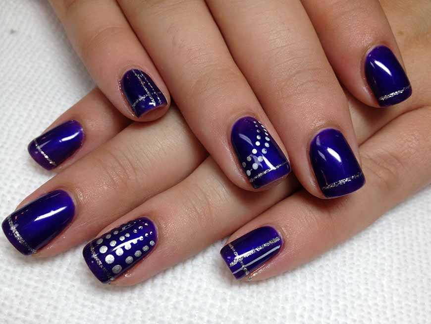 - Глубокий фиолетовый – веселый и яркий цвет, который особенно выделяется осенью, эффектно смотрится как на коротких, так и на длинных ногтях.