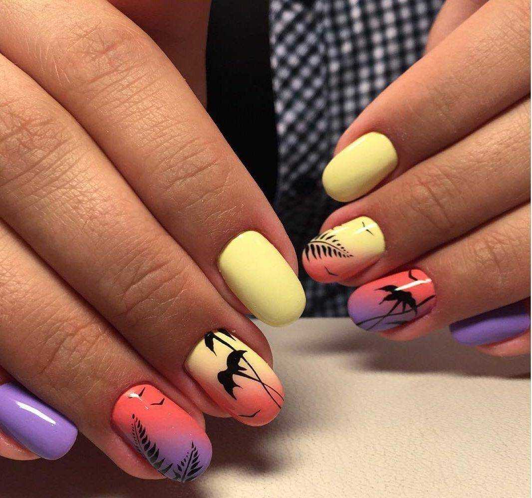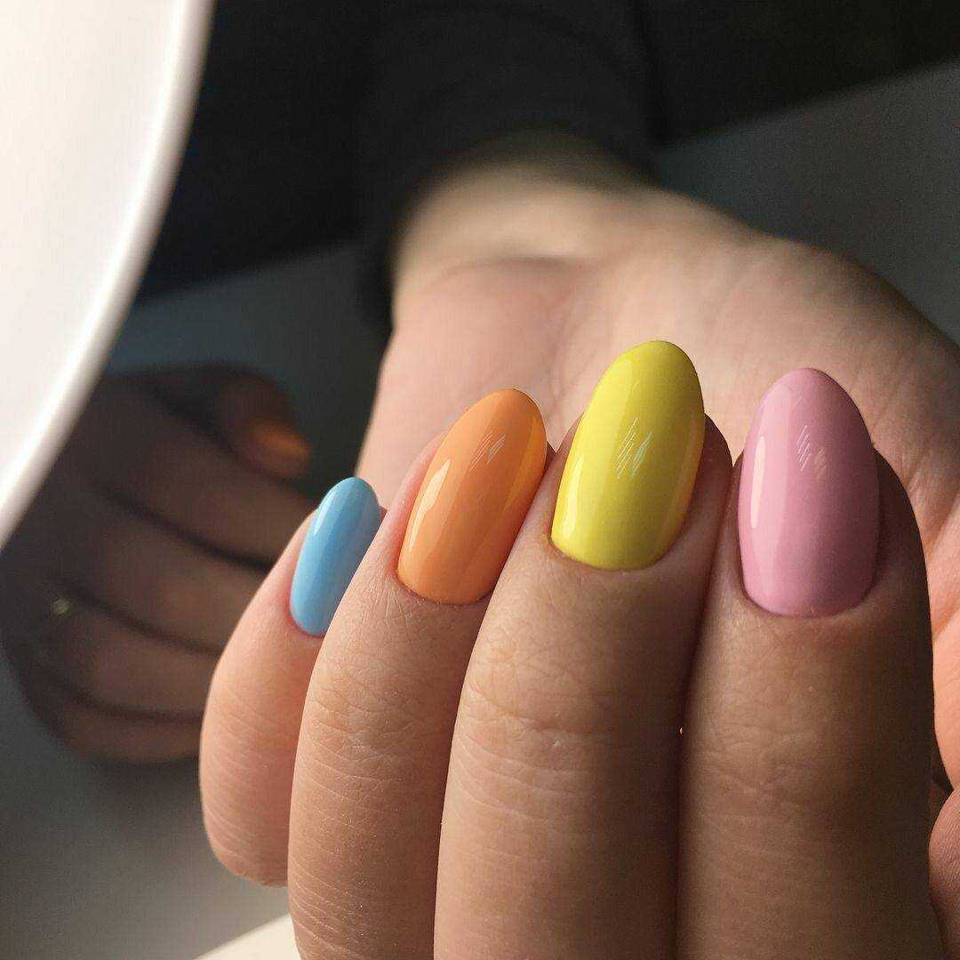 Модные тенденции летнего маникюра представляют этим летом миндалевидную и овальную формы. Буйство красок в природе зеркально отражается на разноцветных ноготках прекрасных дам.