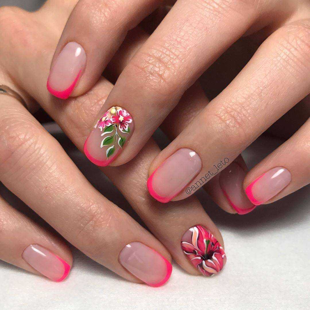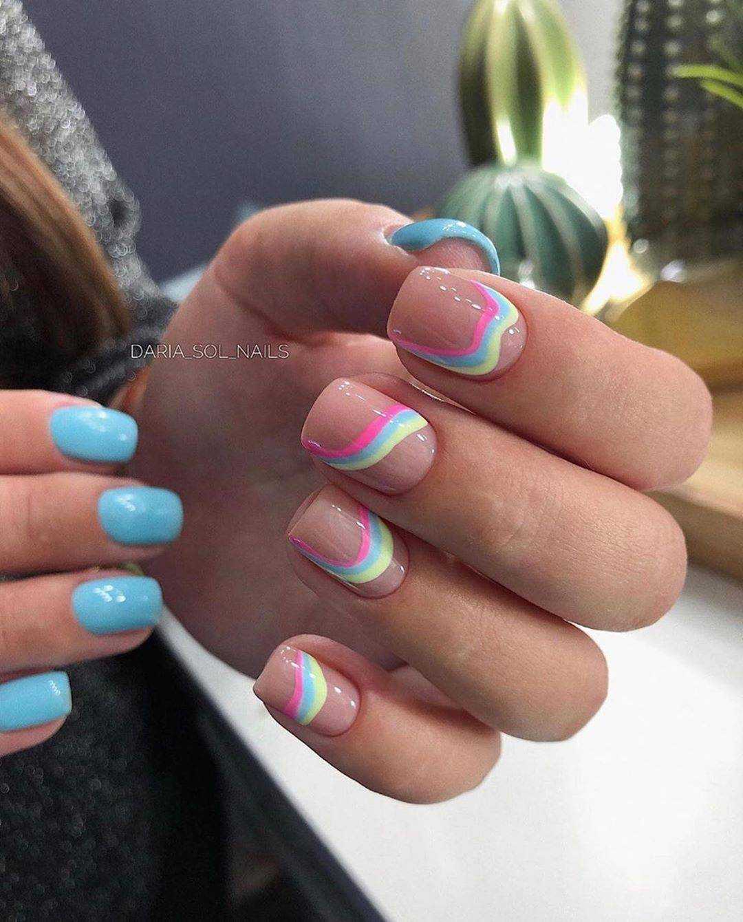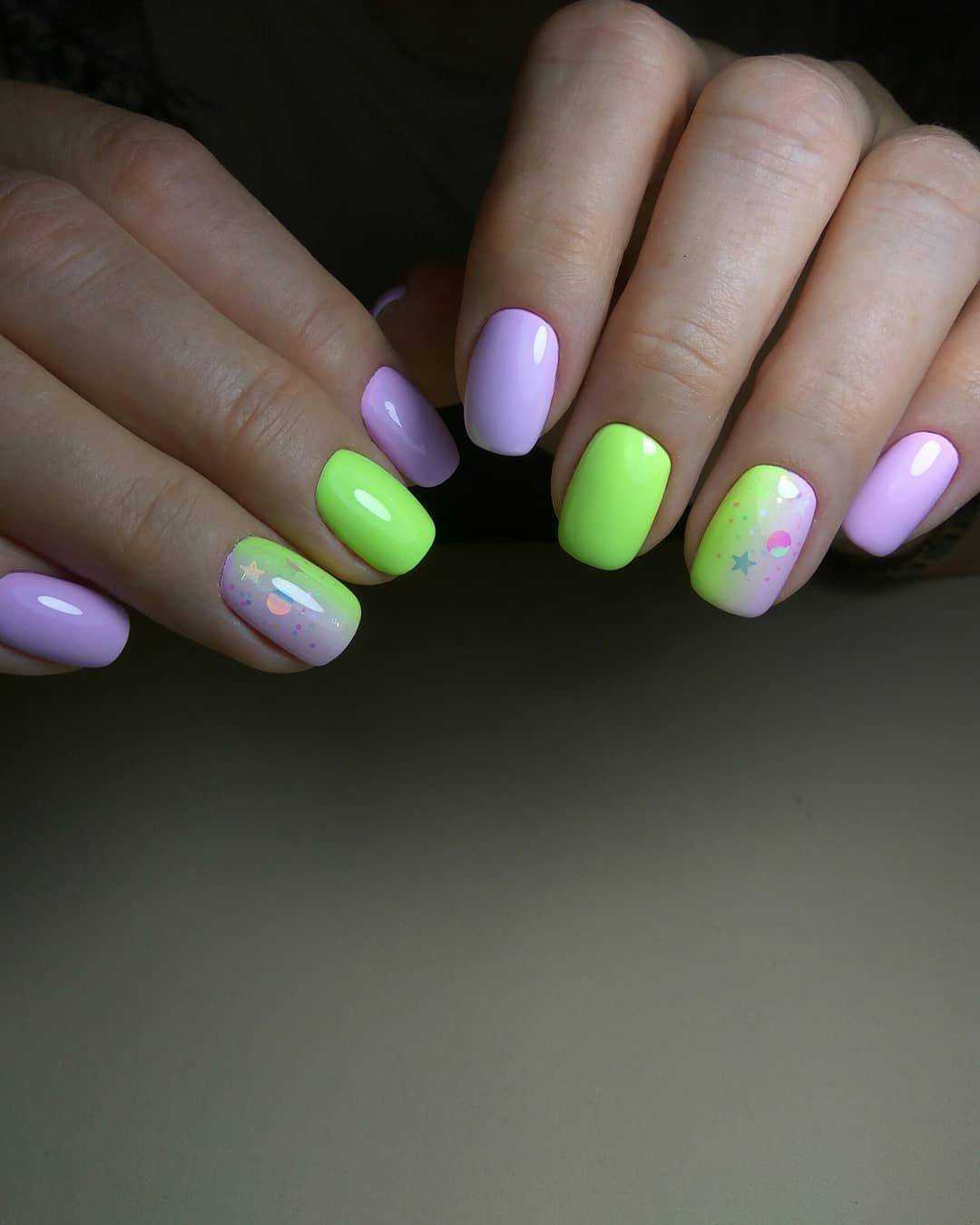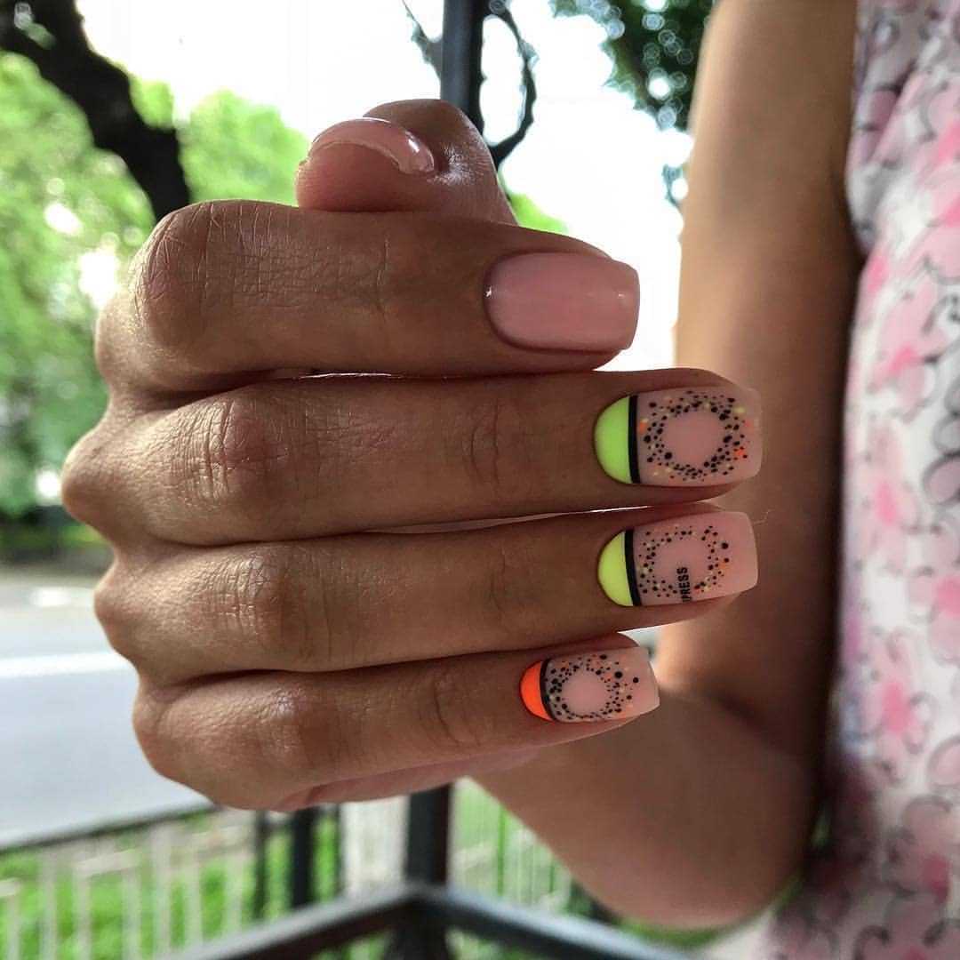 Самый простой, но оттого не менее красивый способ украшения коротких ногтей — летний дизайн с неоновыми оттенками. Лунный маникюр, неоновые мазки/кляксы на прозрачном покрытии или разноцветная радуга из гибких ленточек — решать вам. Весенний вариант с пастельными оттенками и единичными рисунками веточек/цветов, сердечек сделает маникюр эстетичным.