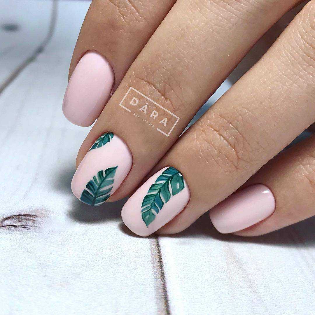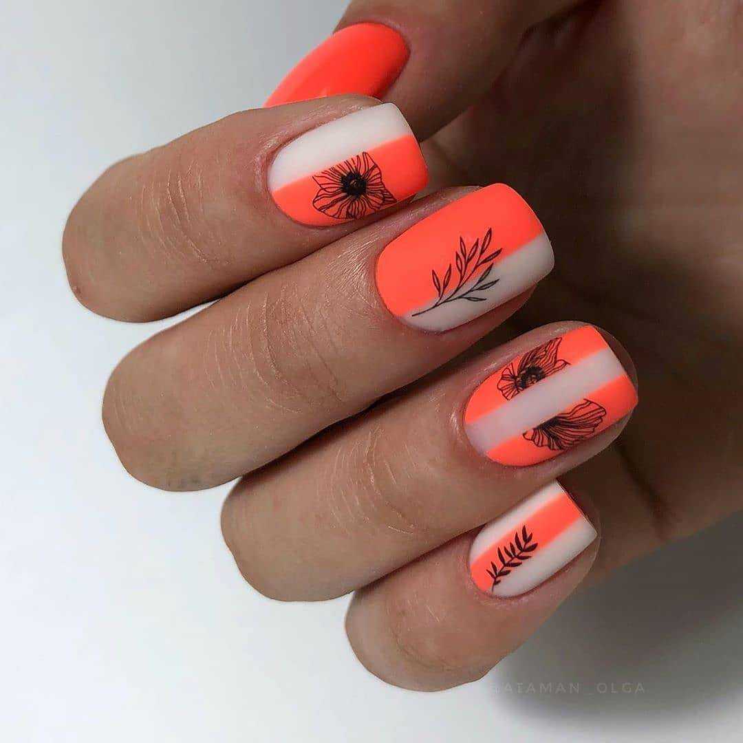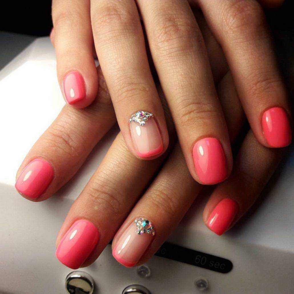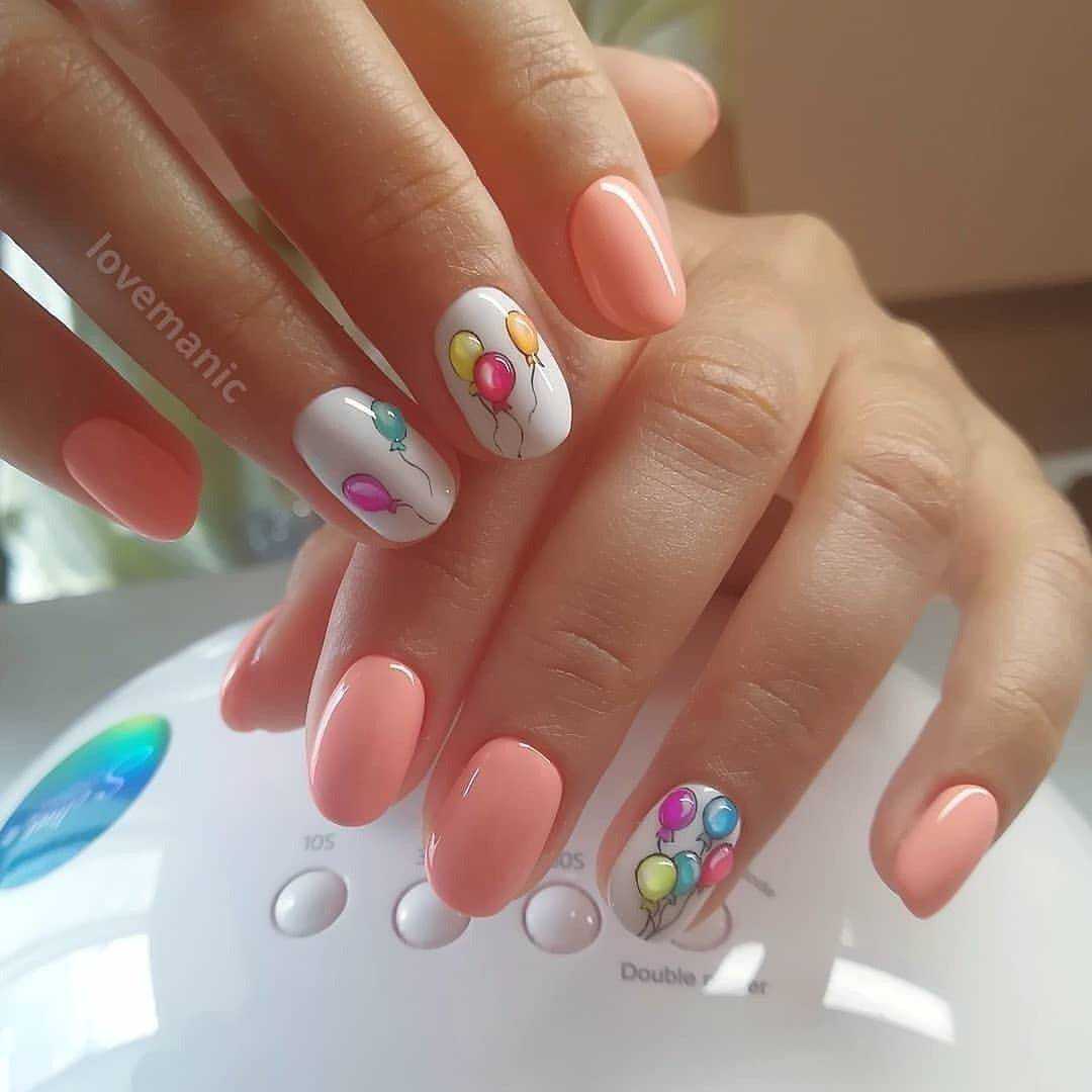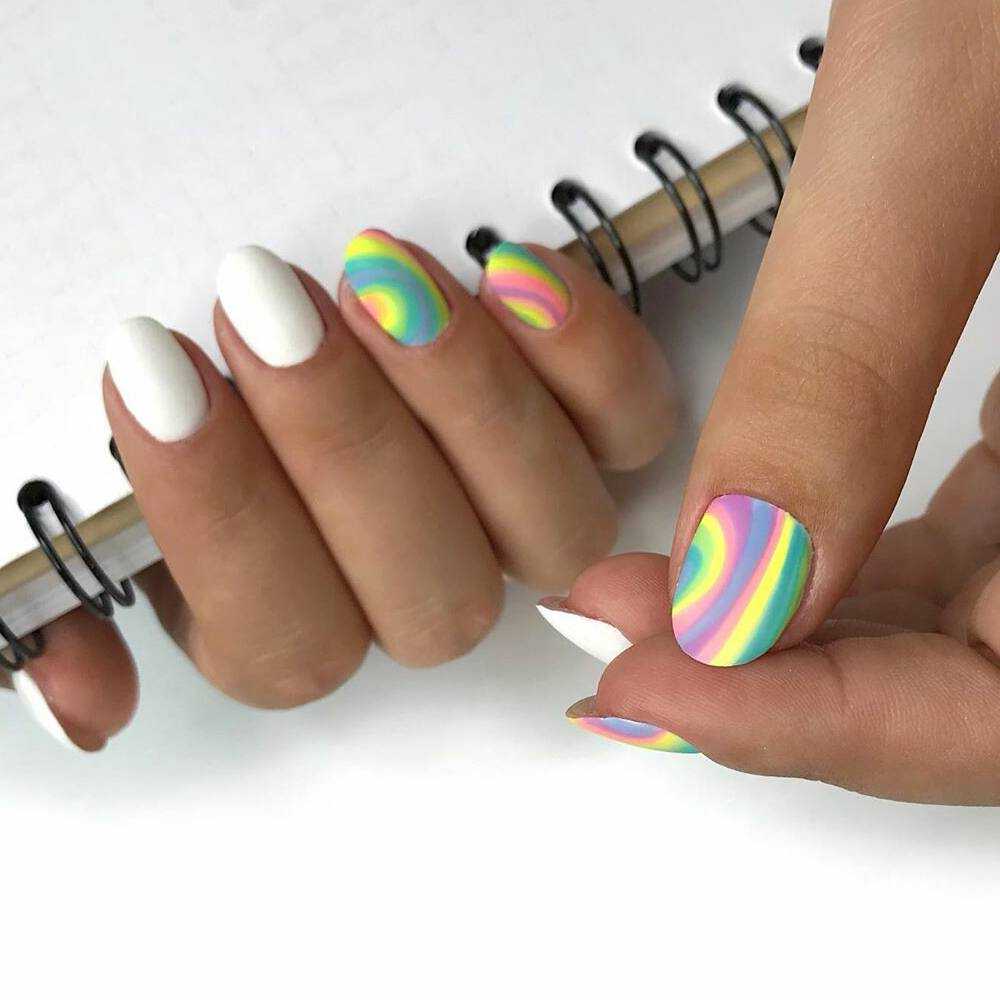 Самый простой, но оттого не менее красивый способ украшения коротких ногтей — летний дизайн с неоновыми оттенками. Лунный маникюр, неоновые мазки/кляксы на прозрачном покрытии или разноцветная радуга из гибких ленточек — решать вам. Весенний вариант с пастельными оттенками и единичными рисунками веточек/цветов, сердечек сделает маникюр эстетичным.