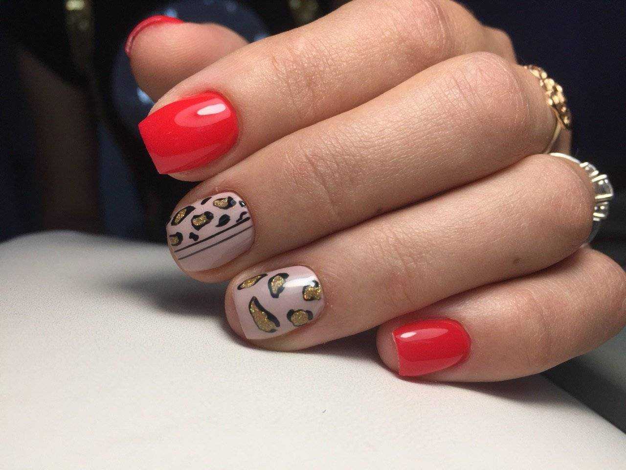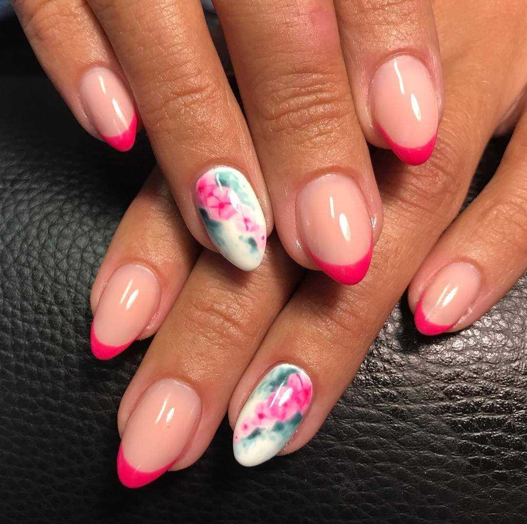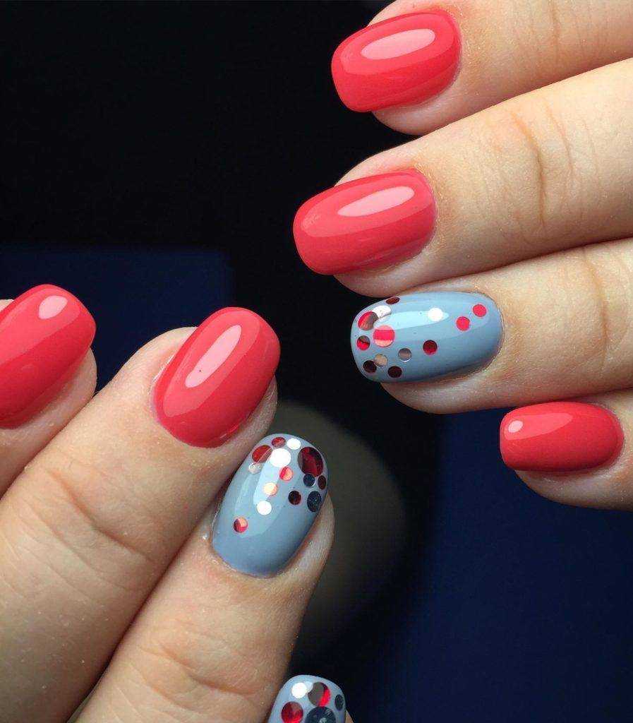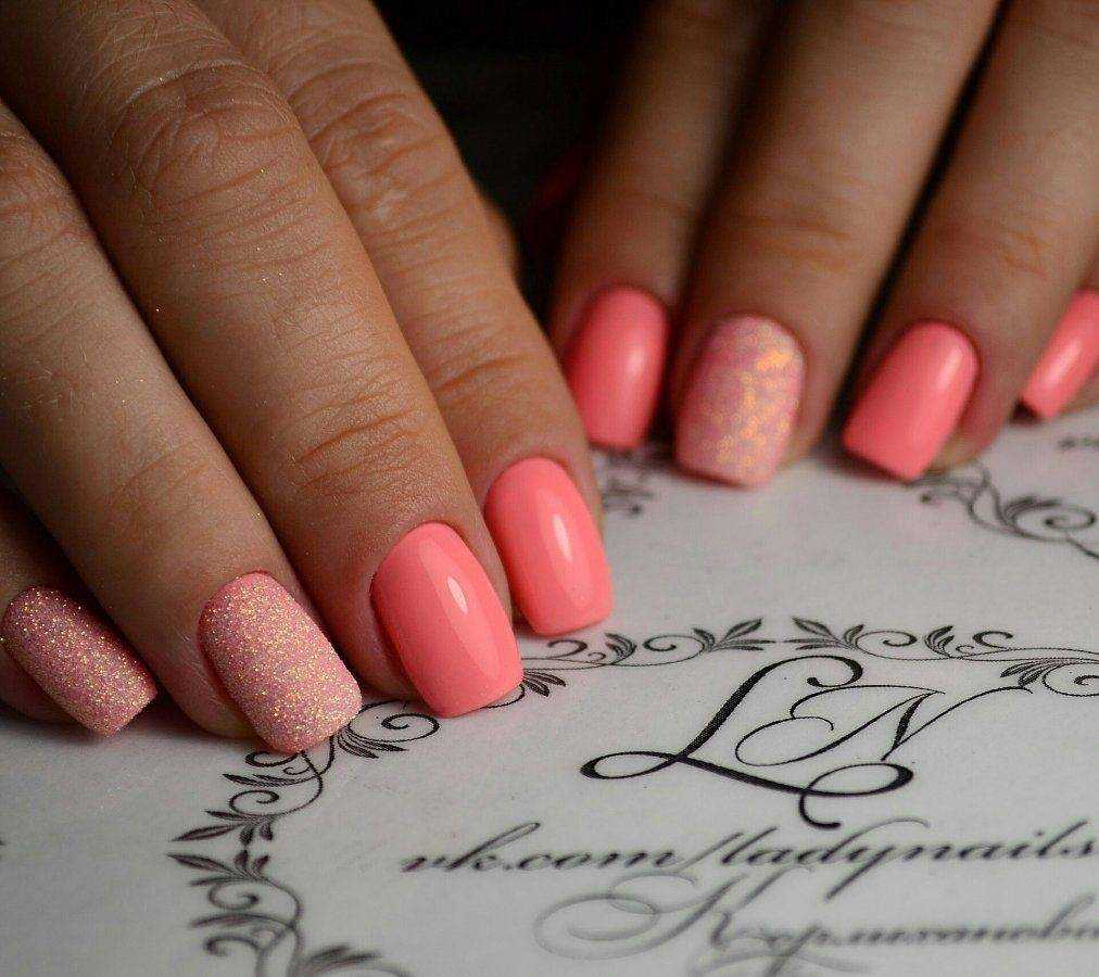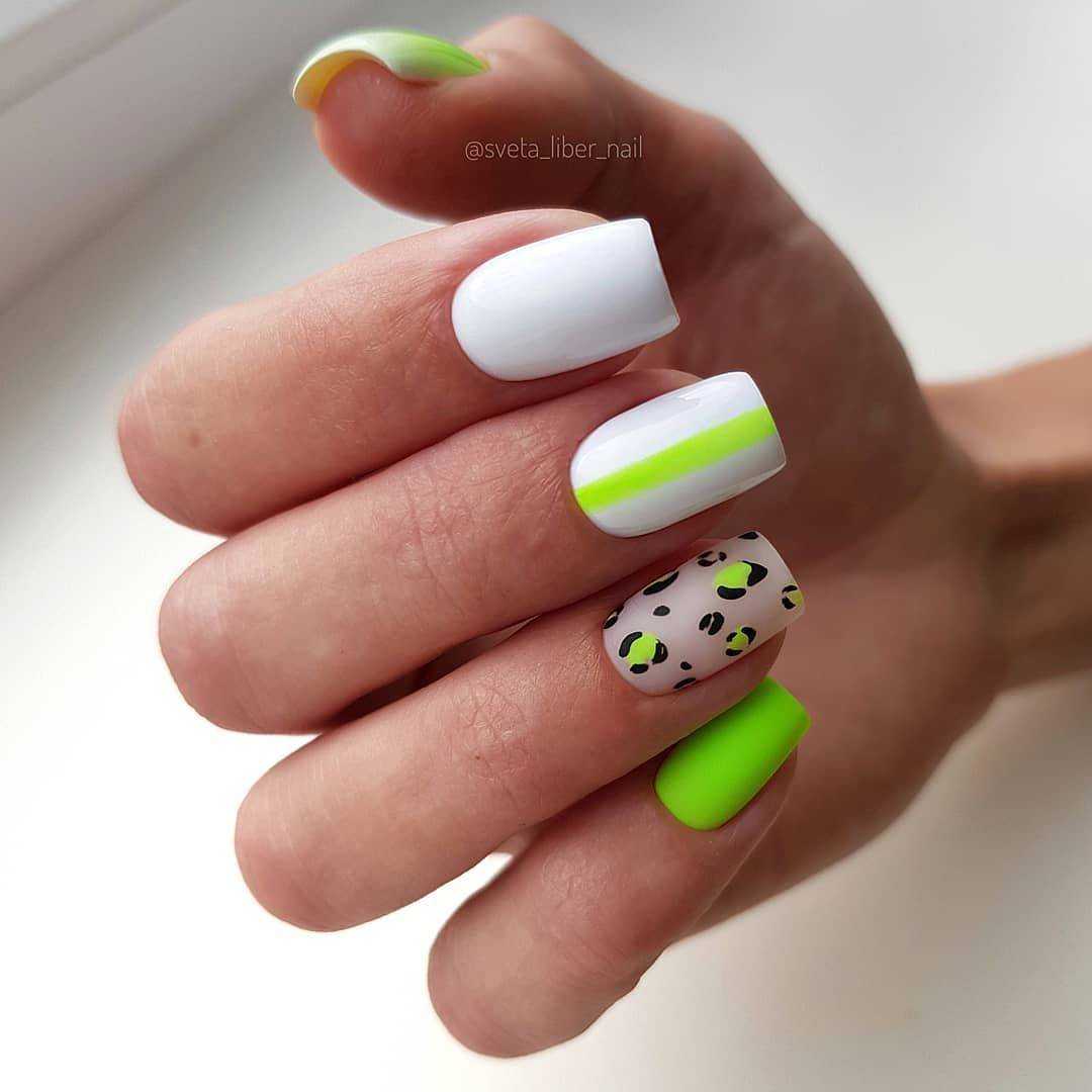 Самый простой, но оттого не менее красивый способ украшения коротких ногтей — летний дизайн с неоновыми оттенками. Лунный маникюр, неоновые мазки/кляксы на прозрачном покрытии или разноцветная радуга из гибких ленточек — решать вам. Весенний вариант с пастельными оттенками и единичными рисунками веточек/цветов, сердечек сделает маникюр эстетичным.