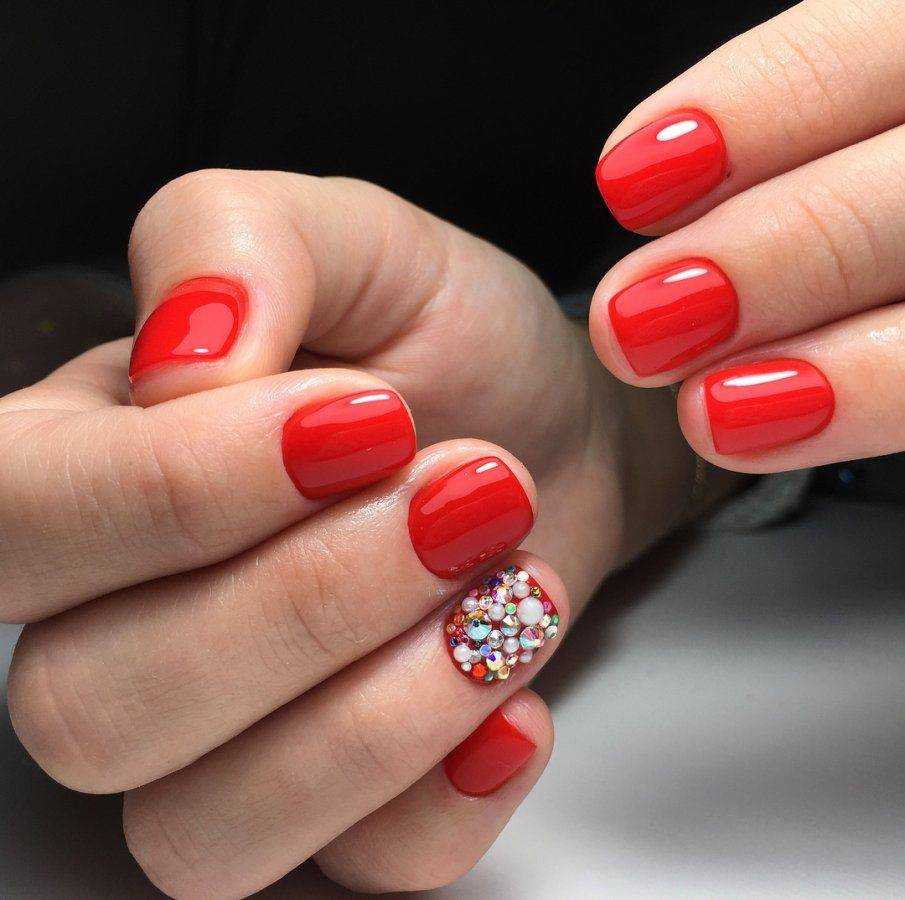 Чтобы маникюр смотрелся стильно и изысканно совсем не обязательно нагромождать его эффектным декором. Однотонное покрытие вполне справится с задачей создания стильного и оригинального маникюра. В качестве основных оттенков используйте оранжевый, желтый, алый, бордовый, индиго, лимонный и другие тона. На коротких ногтях они будут смотреться аккуратно и ухоженно.