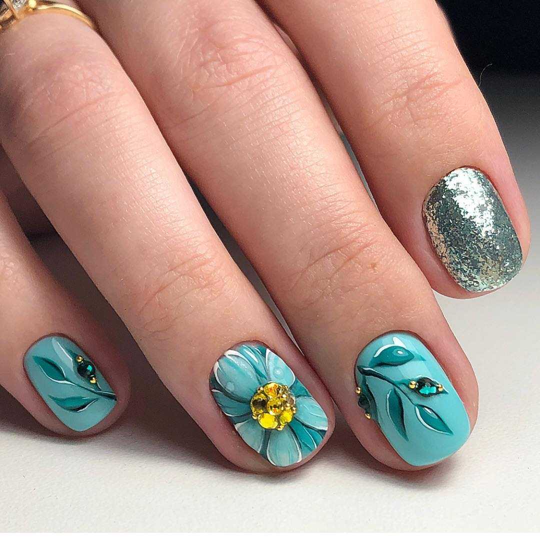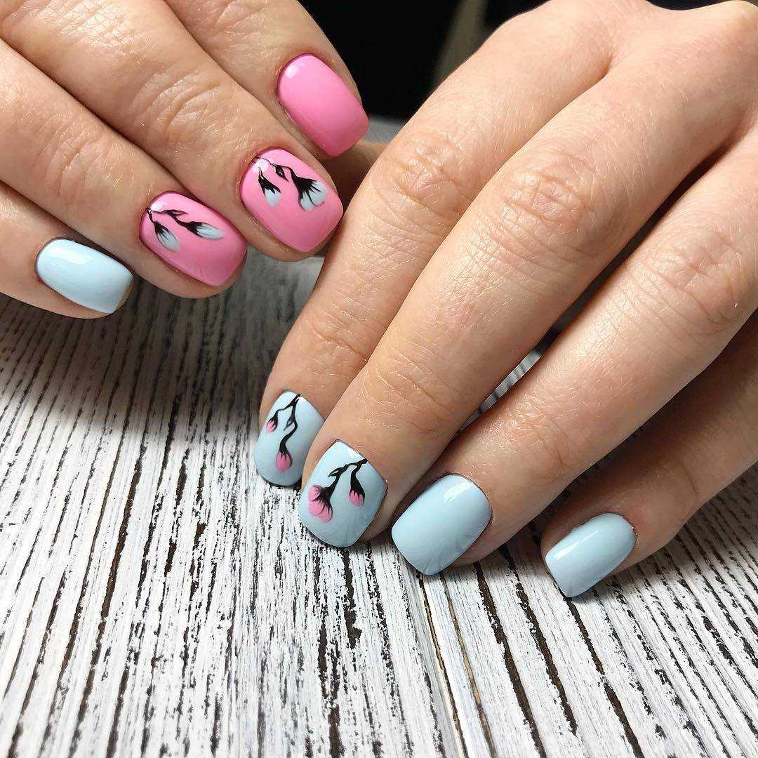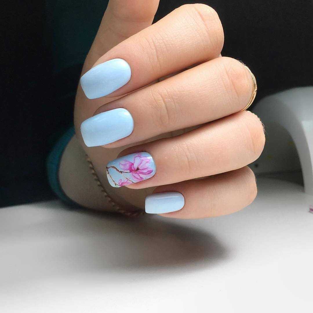 Нежно-голубой цвет в маникюре часто встречается весной и летом. При этом преобразить ноготки с помощью голубого цвета можно и зимой, украсив поверхность снежинками, зимними картинами природы или праздничными рисунками. Для создания нежного маникюра с голубым часто используют розовый, бежевый, красный, черный и белый цвет. Голубой цвет используют как основной, остальными же цветами прорисовывают бутоны, геометрические фигуры, цветы и абстракции. Часто при выполнении рисунка на ногтях хочется легкости и нежности. В таком случае выбирают маникюр с нежно-голубыми цветами, где основным цветом будет белый.