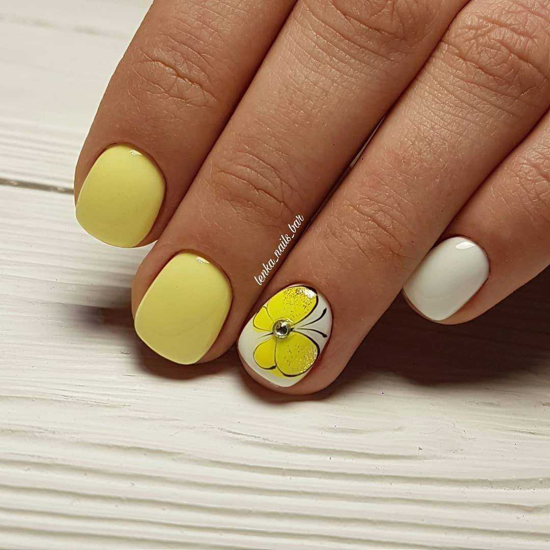 Яркое солнце так активно в июле, поэтому мы рекомендуем использовать желтый цвет в маникюре. Например, сделать матовый дизайн или нарисовать веселое солнышко на нейтральной базе.