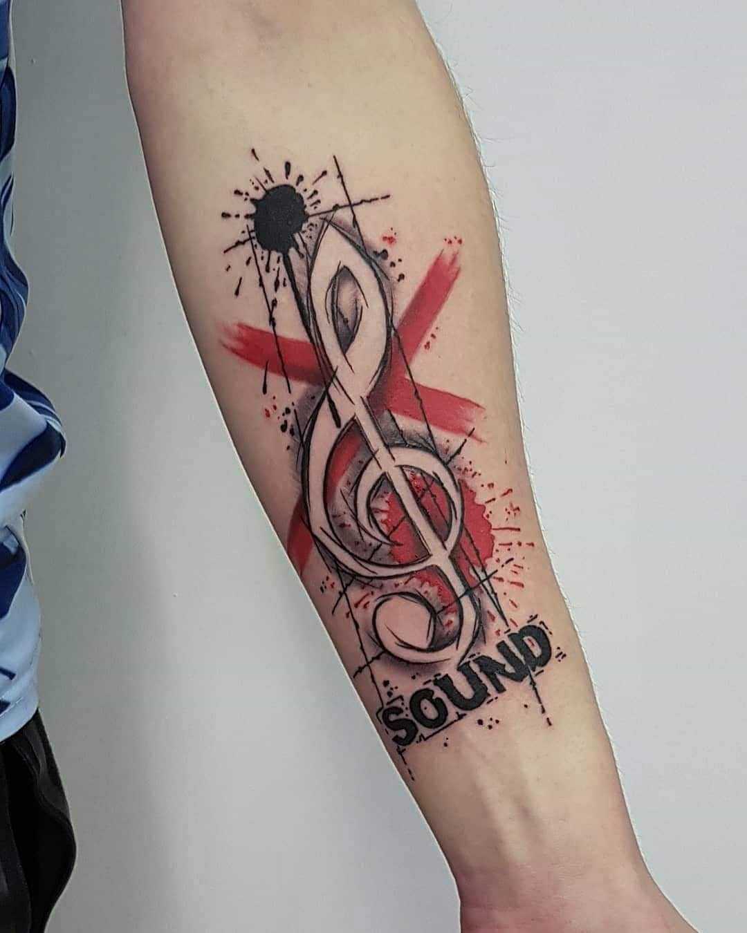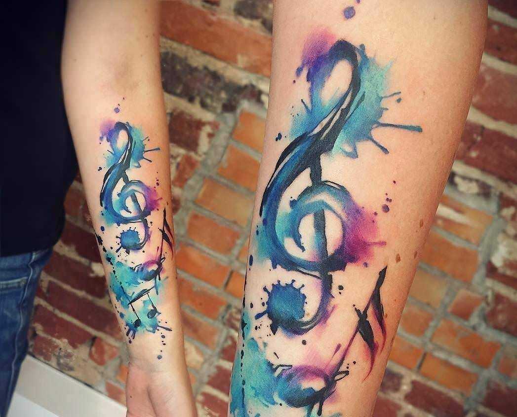 Такой рисунок на теле объединяет две страсти: музыку и татуировку. Это наиболее подходящий символ для музыкантов или меломанов. Татуировка чаще всего означает любовь к музыке.