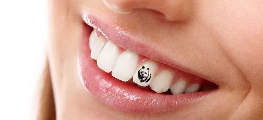 На смену популярному движению украшения коронок драгоценными камнями пришла мода на декорирование эмали разного рода рисунками. Зубные татуировки наносятся на эмаль посредством внедрения в верхние слои наноматериала на основе атомов углерода.