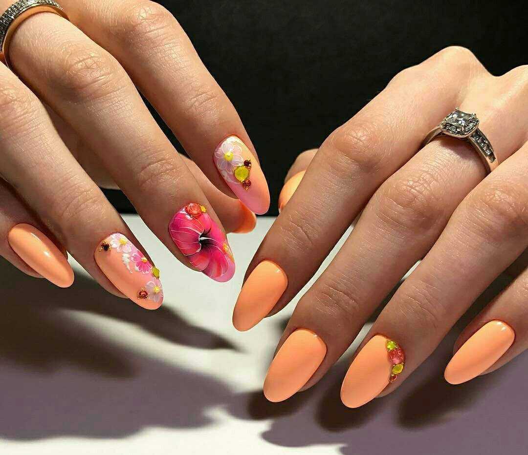 Нежный розовый в паре с оранжевым — хорошая идея для омбре, лунного дизайна ногтей, “вязаного” маникюра и “разных рук”.