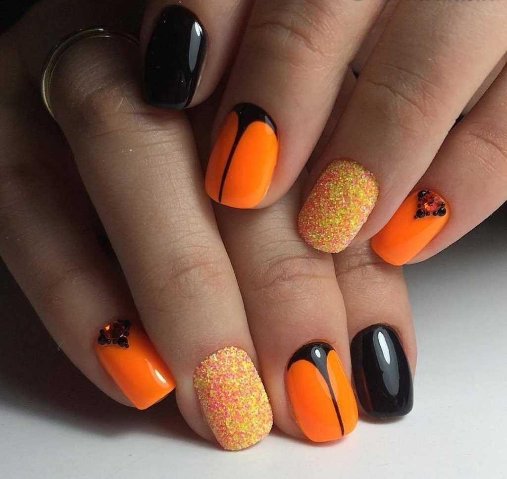 Стразы являются излюбленным элементом в нейл-индустрии. Очень часто камни используют на праздник. Стразы подойдут к оранжевому, добавляя больше блеска.