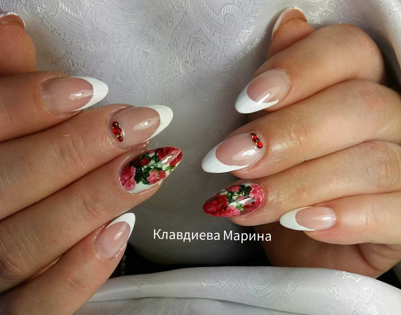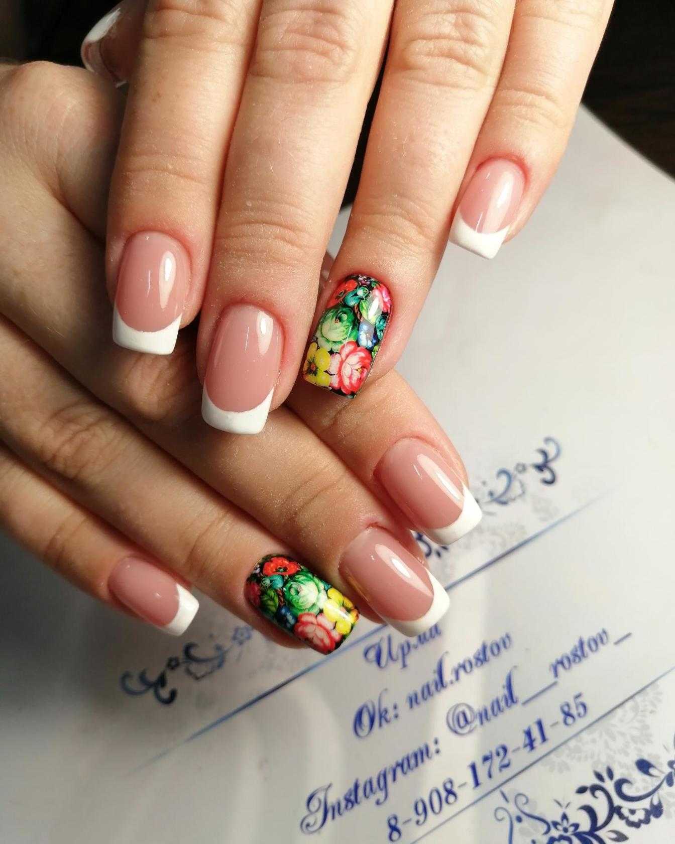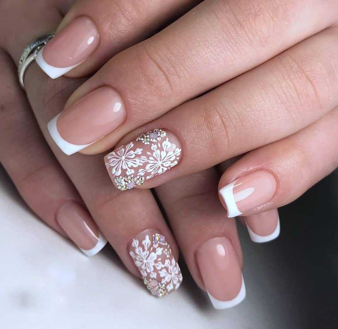 Во французском маникюре можно выделить самый кончик ноготка или одним цветом, или же полноценным рисунком. Рисунки могут быть разнообразные, как ажурные, так и более спокойные, и нежные. Наиболее популярными рисунками в таком маникюре являются: кружевные и ажурные рисунки, цветочный узор, «природная текстура», геометрия и абстракция.