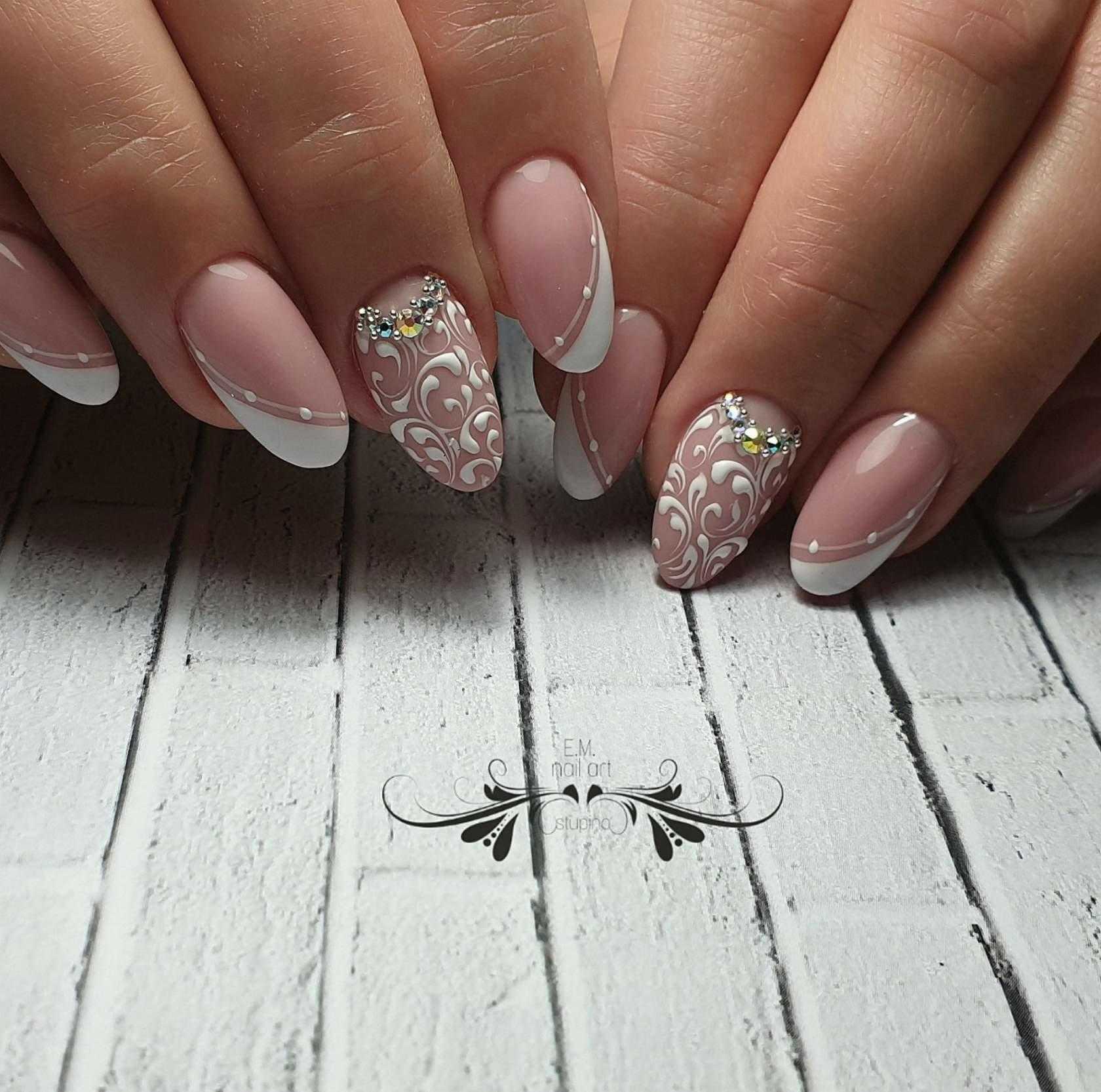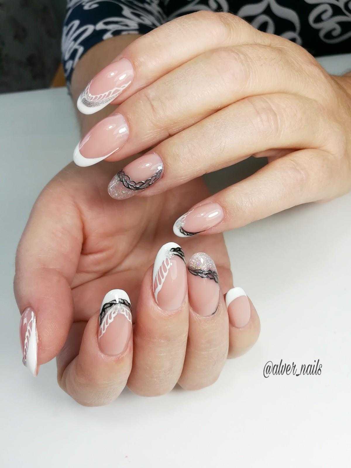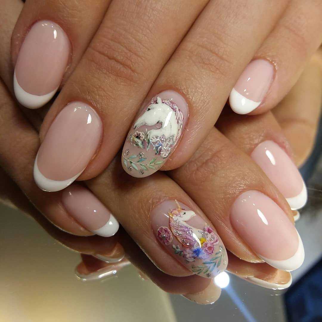 Во французском маникюре можно выделить самый кончик ноготка или одним цветом, или же полноценным рисунком. Рисунки могут быть разнообразные, как ажурные, так и более спокойные, и нежные. Наиболее популярными рисунками в таком маникюре являются: кружевные и ажурные рисунки, цветочный узор, «природная текстура», геометрия и абстракция.