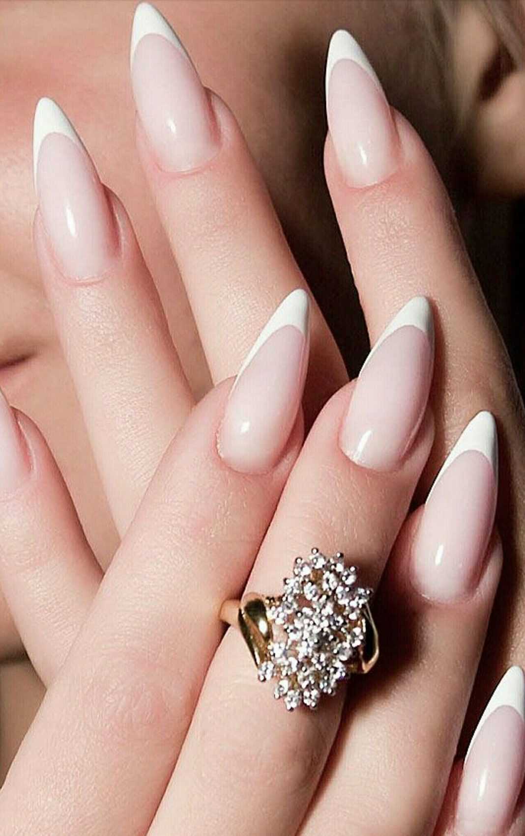 Достигается при помощи постепенных скосов с обеих сторон от центра ногтевой пластины. Миндалевидная форма пользуется большой популярностью среди девушек и женщин любого возраста. Так ноготки визуально выглядят длиннее и тоньше.