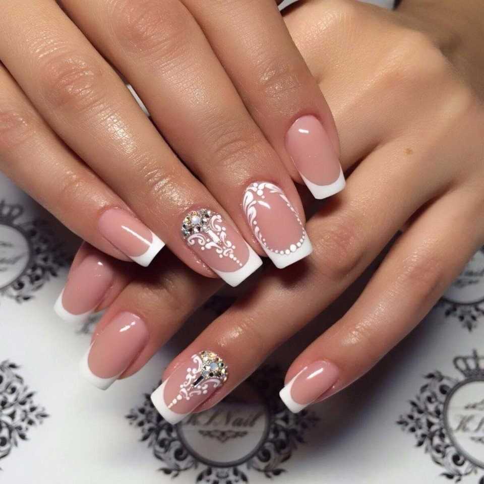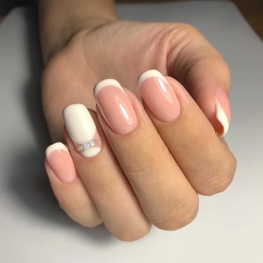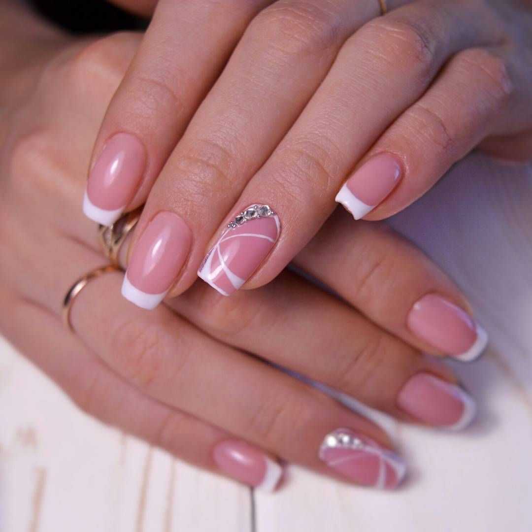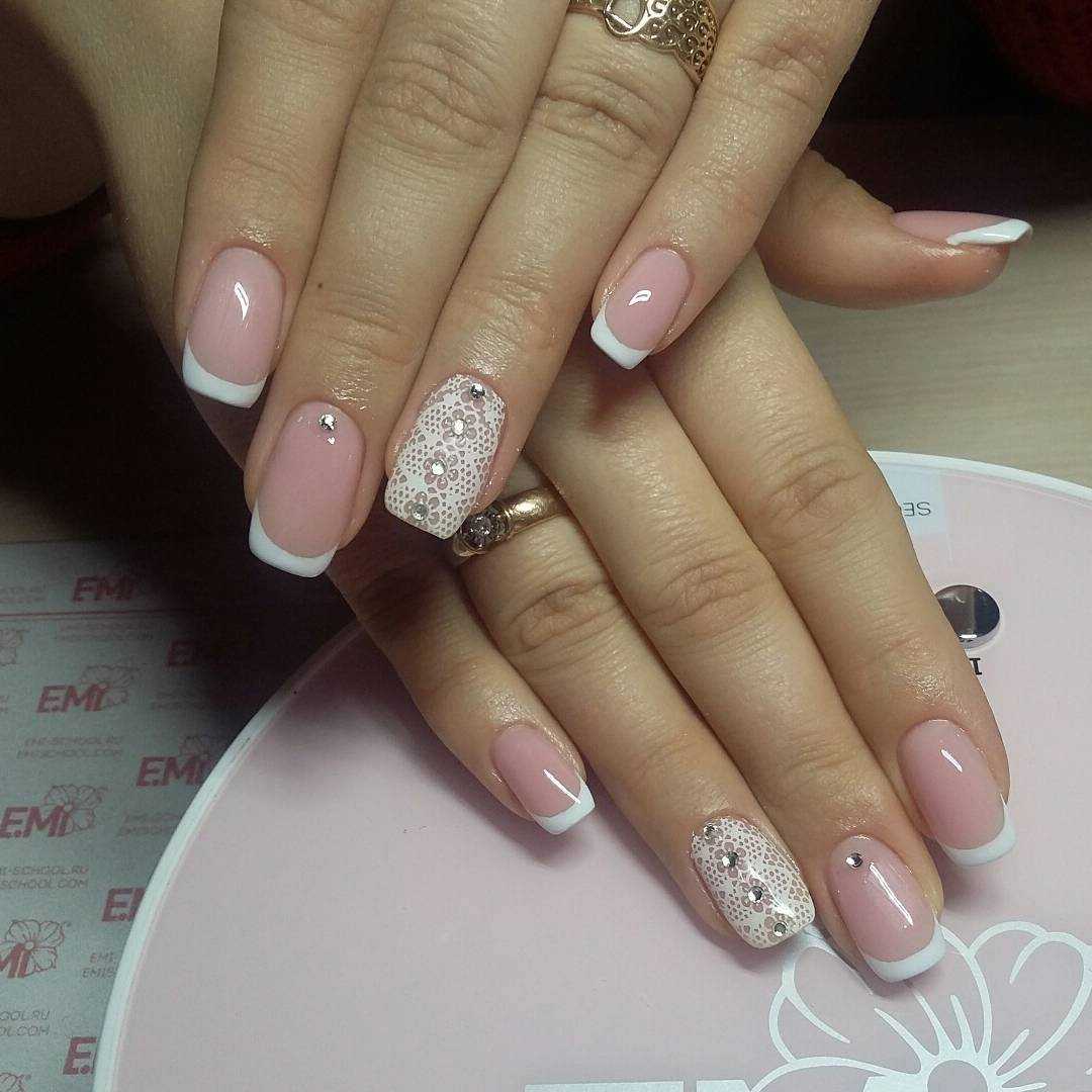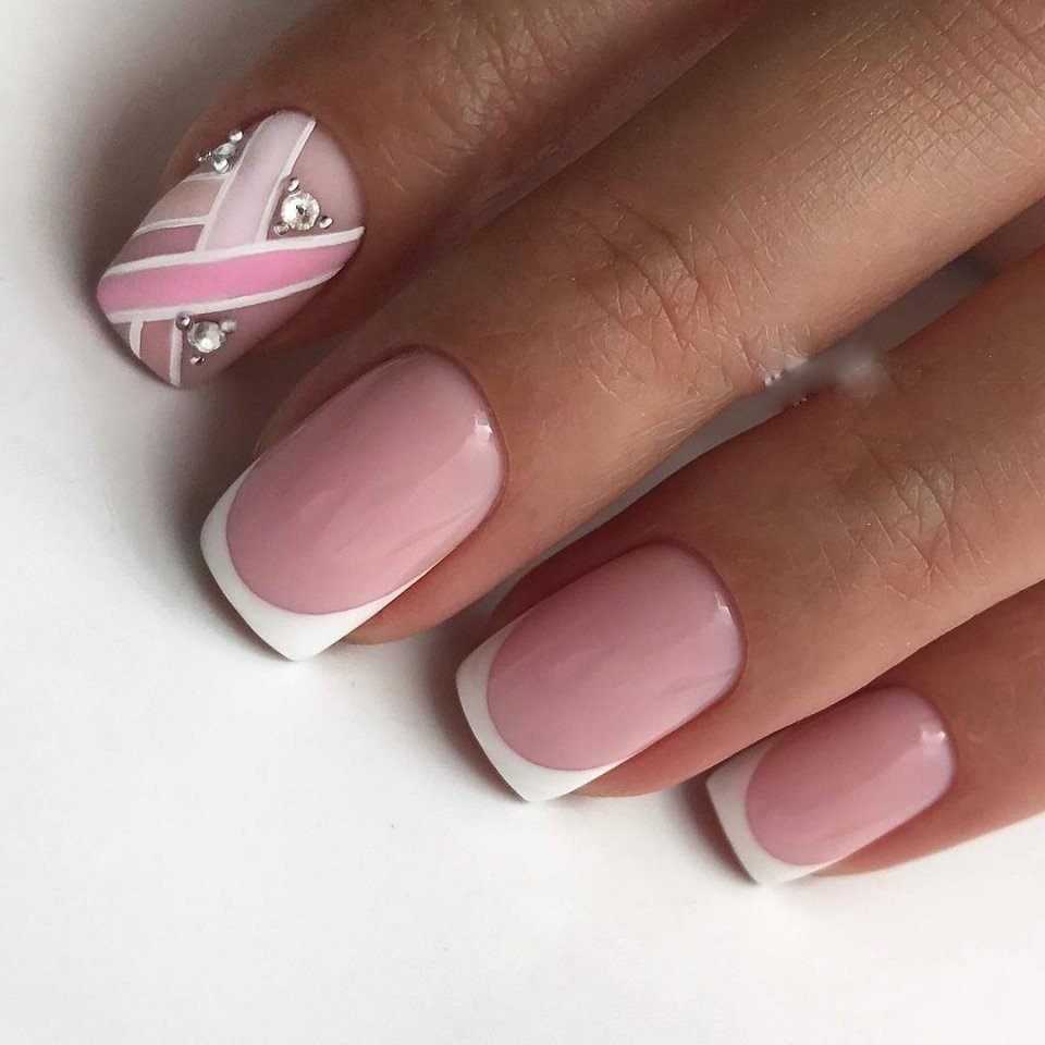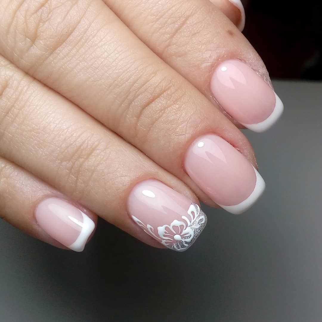 - классическое сочетание белого френча с нежно-розовой подложкой;