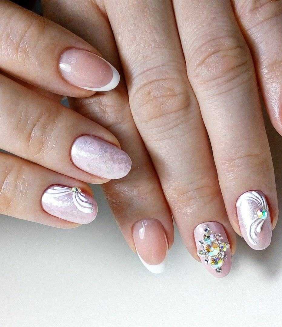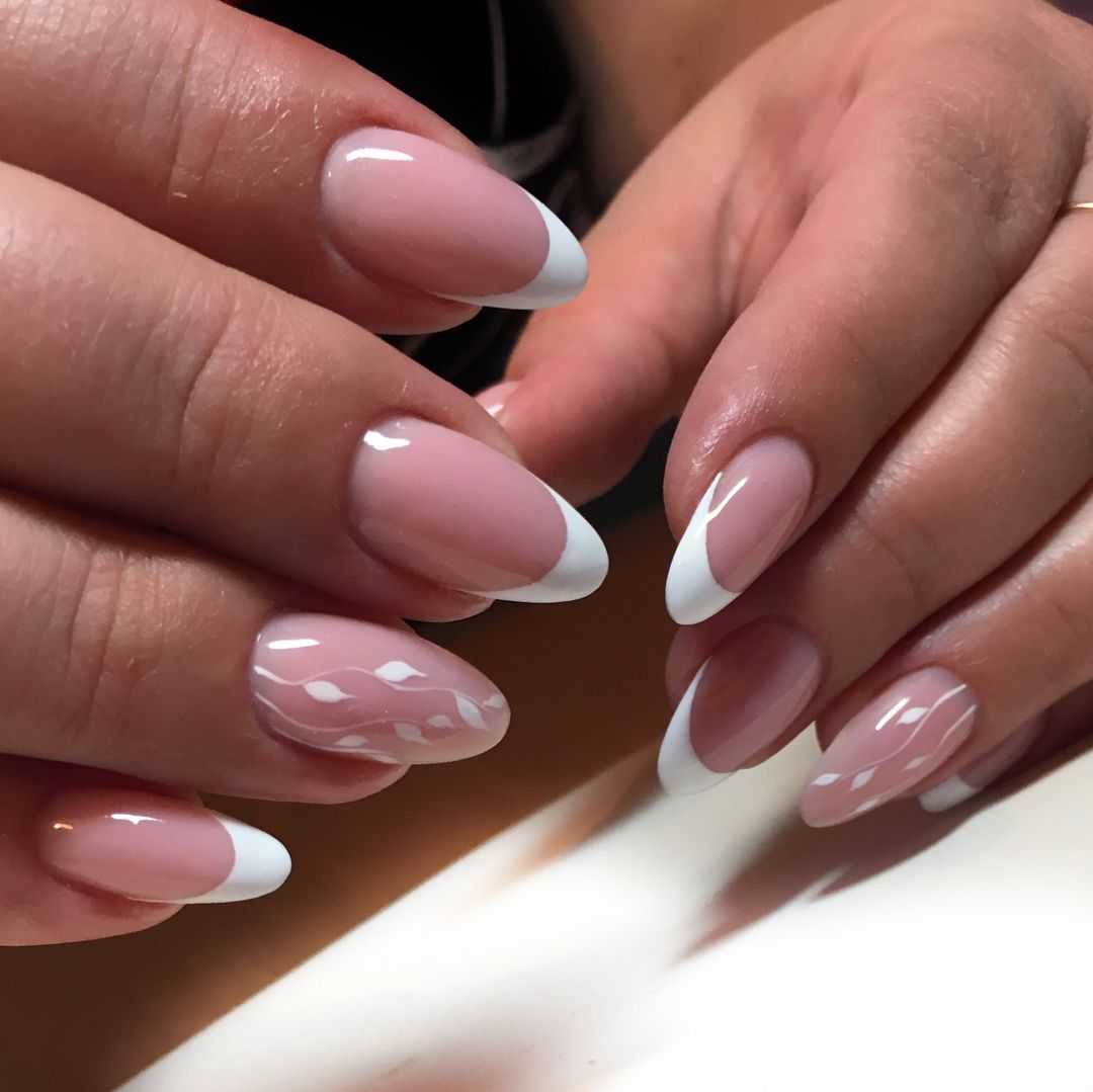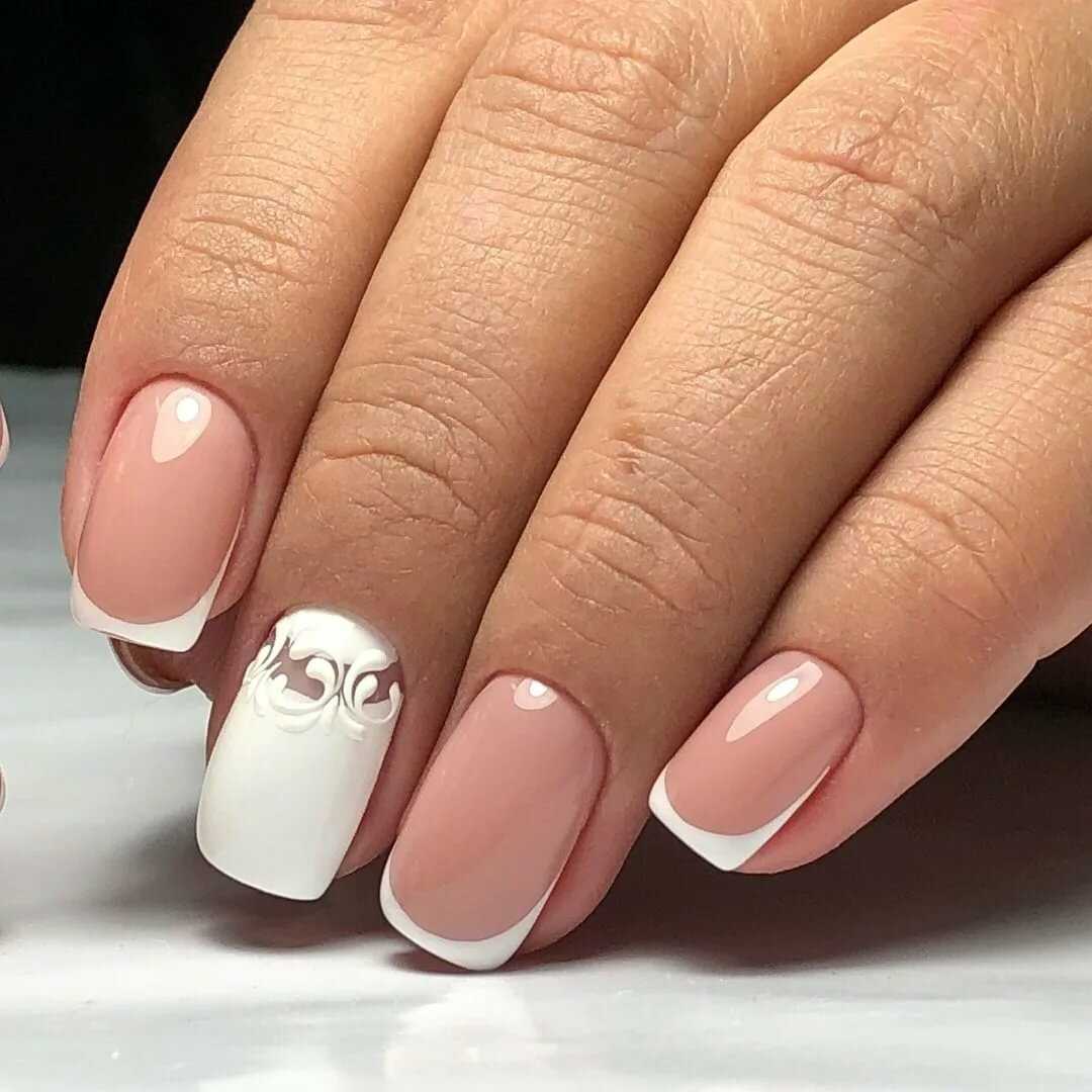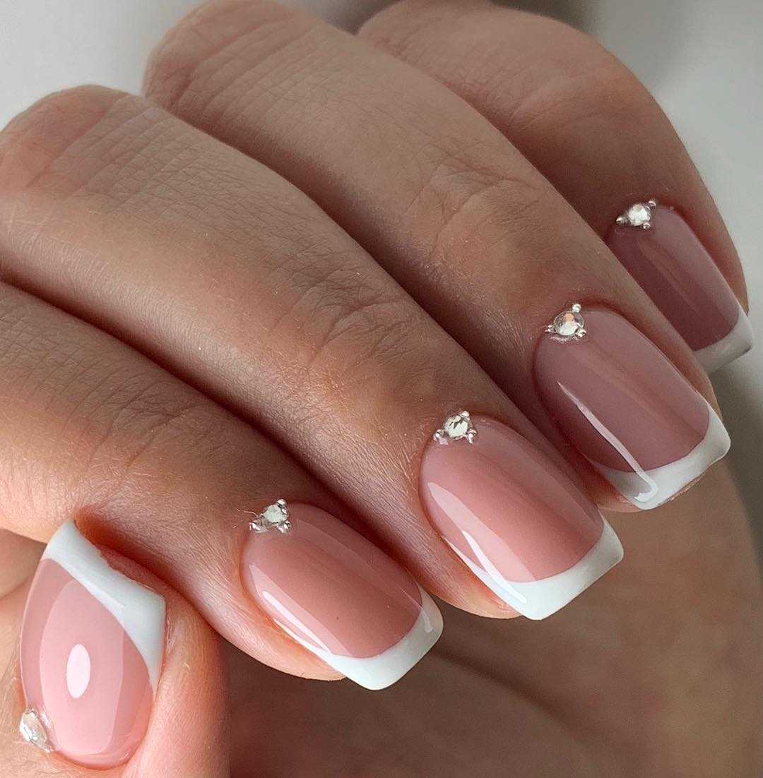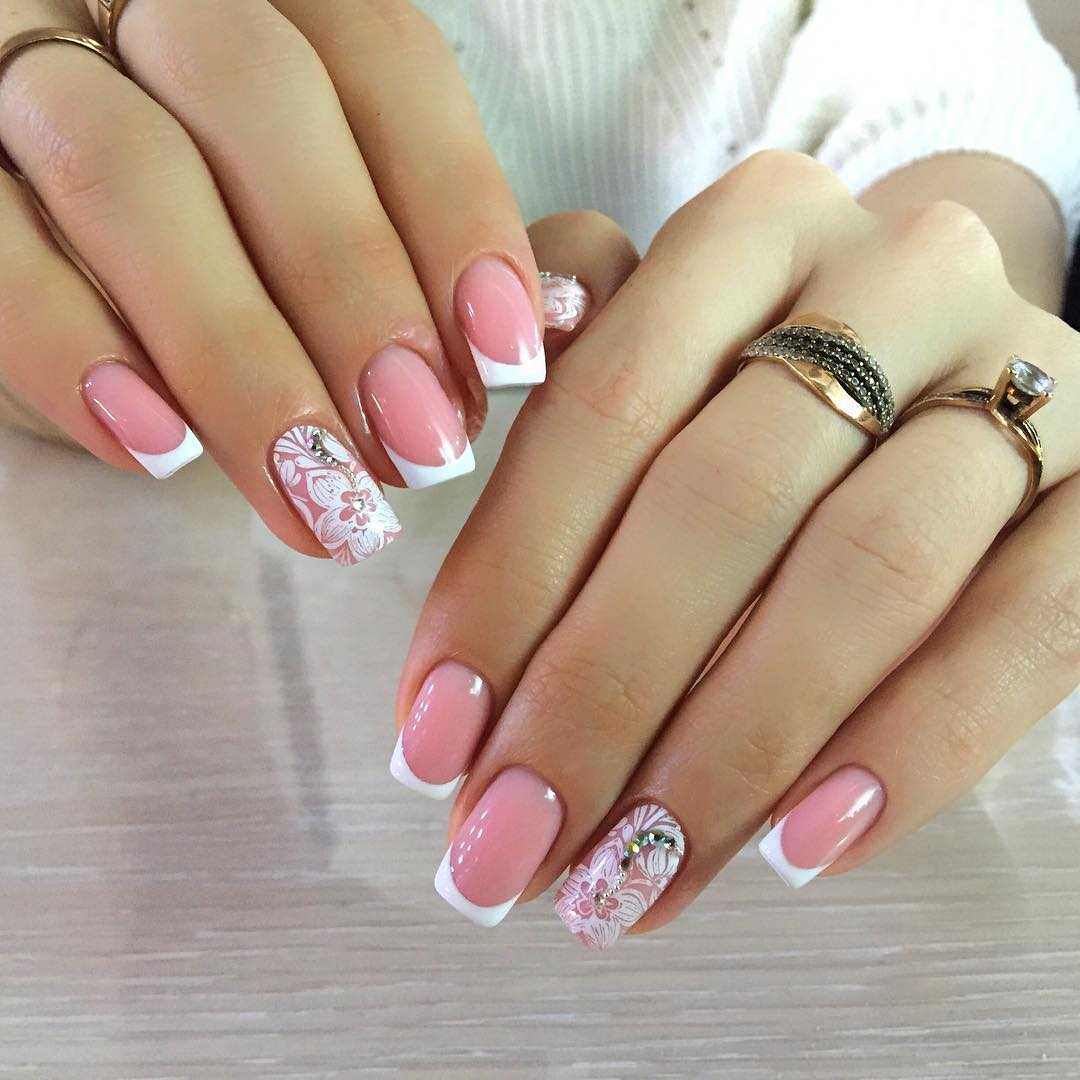 - классическое сочетание белого френча с нежно-розовой подложкой;