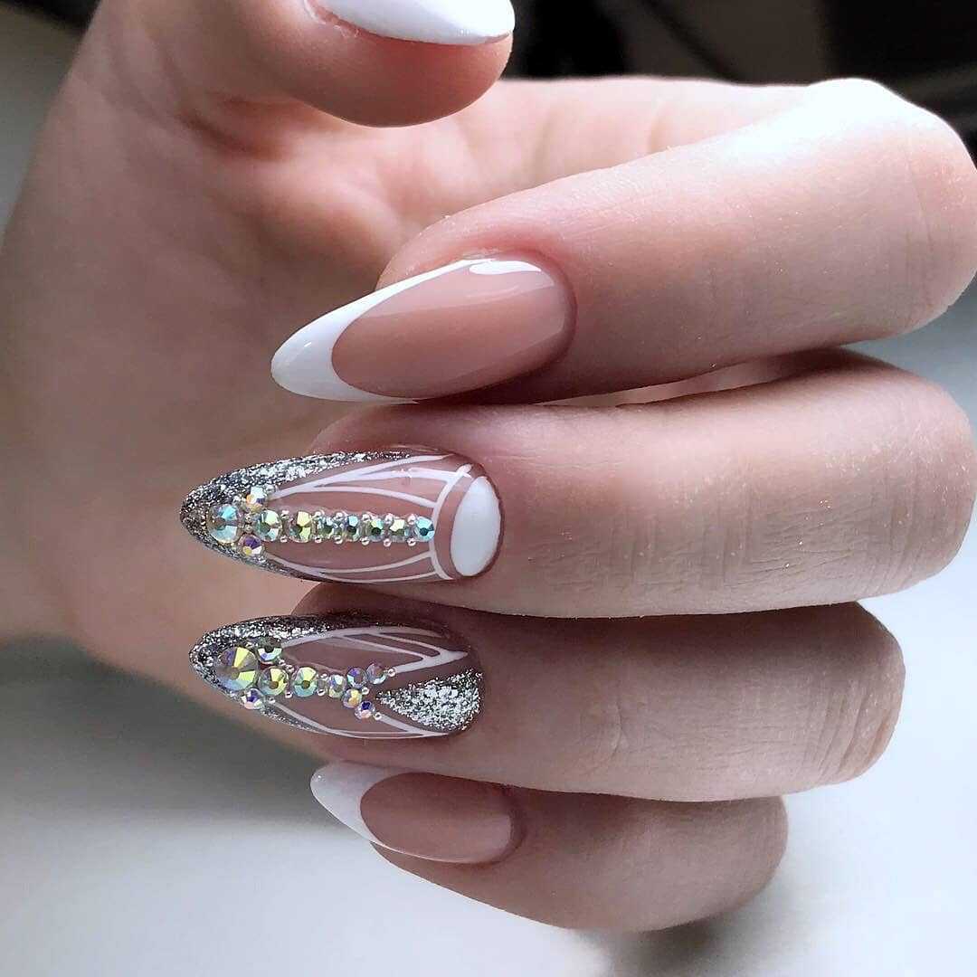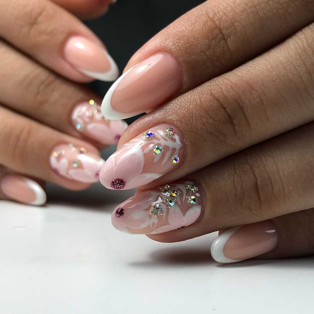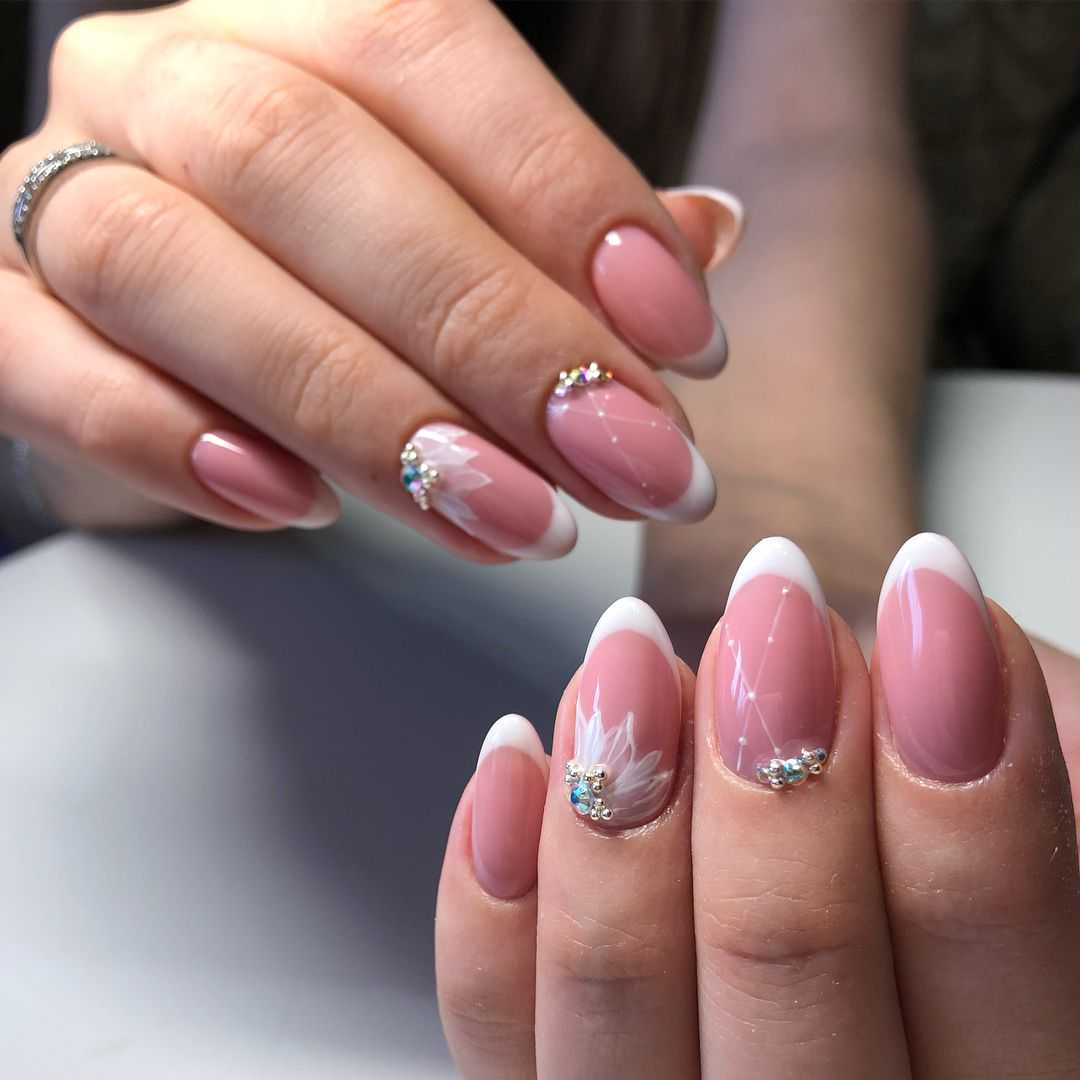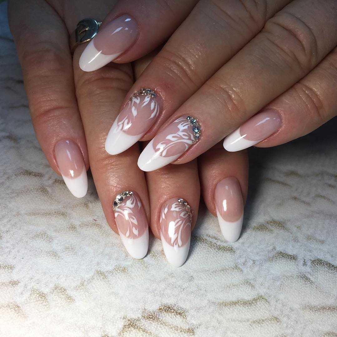 В большинстве случаев французский маникюр выполняется в нежном белом цвете. Именно этот цвет способен придать образу девушки невинности и романтичности. Френч белого цвета считается универсальным вариантом, ведь он прекрасно подходит как для офисных видов одежды, так и для повседневных нарядов. Овальный френч пришел в моду сравнительно недавно. Поэтому мастера нейл-арта зачастую используют именно данную форму френча. Существуют большое количество прекрасных и утонченных идей, которые отлично соединяются с дополнительными элементами декора, например, цветами, стразами, бульонками, конфетти и другими.