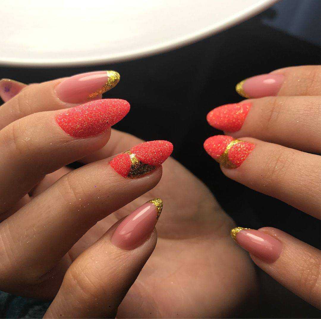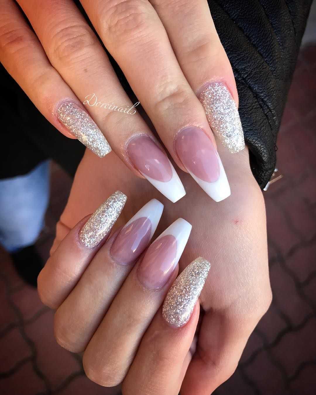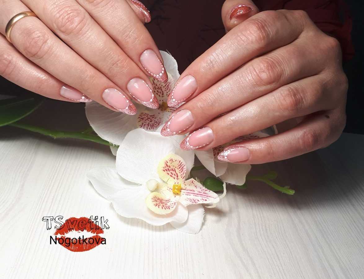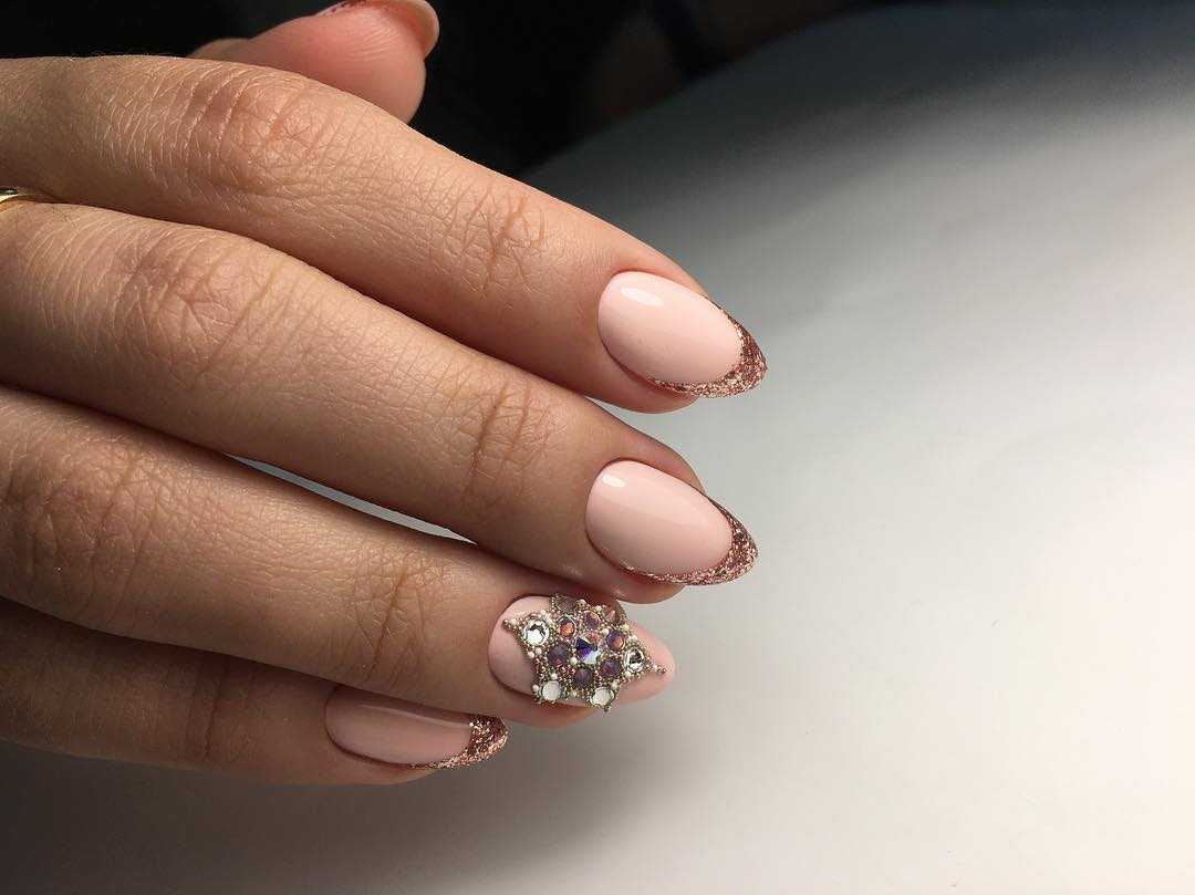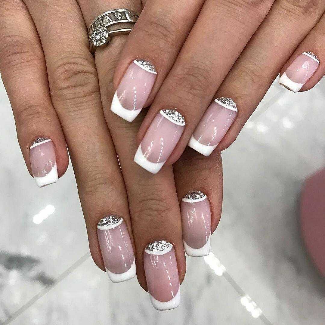 - френч с блестками — сияющие частицы можно заложить в основу или в финишное покрытие.