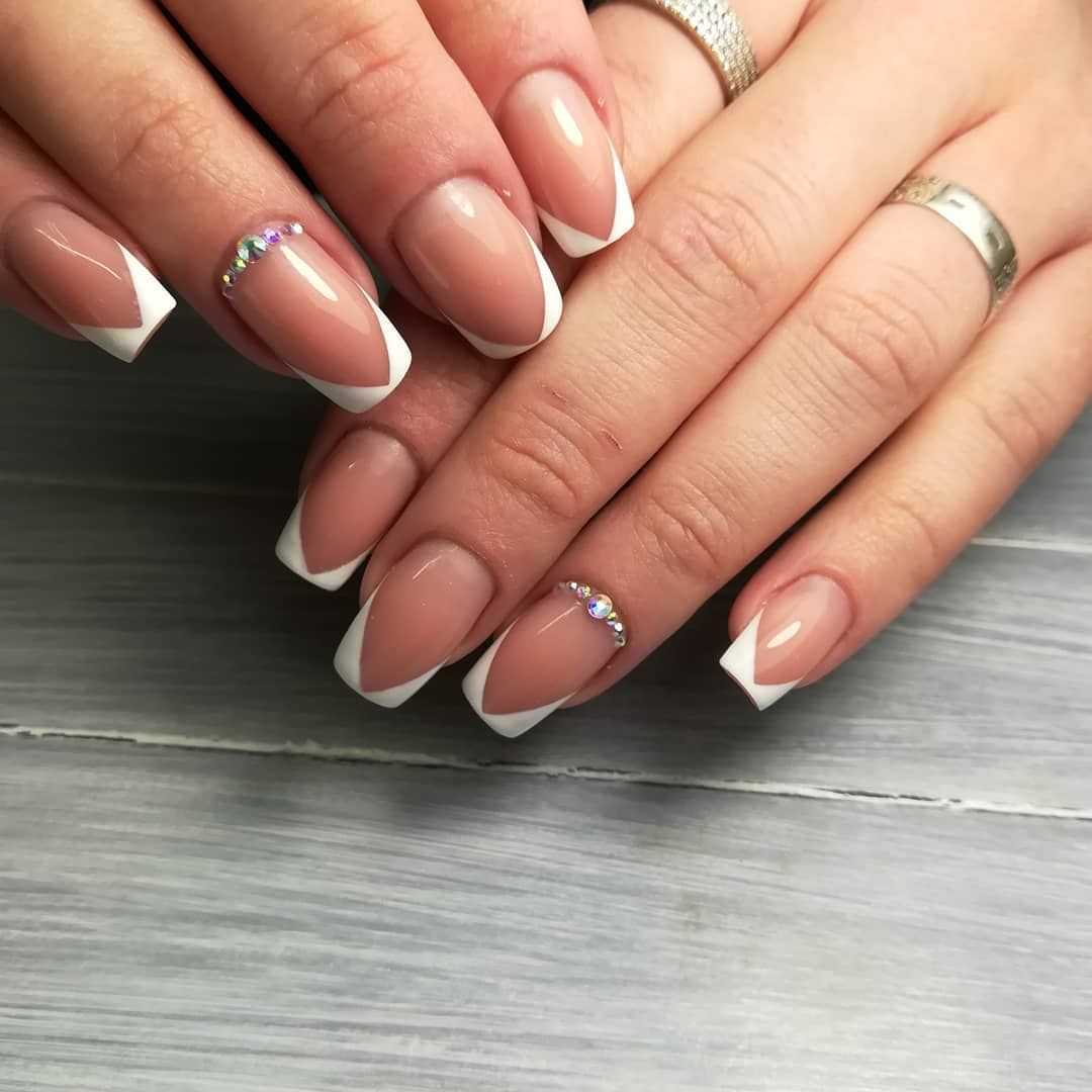 - французский маникюр — неширокая белая полоска по краю ногтя;