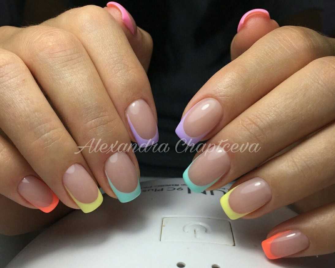 Вот уже несколько лет подряд остается актуальным разноцветный френч. Интересно, что его можно делать не только в теплое время года или для отдыха, но и для работы или повседневной жизни. Причем такой вариант может быть выполнен несколькими способами. В домашних условиях проще всего нанести разные оттенки на каждый ноготок.