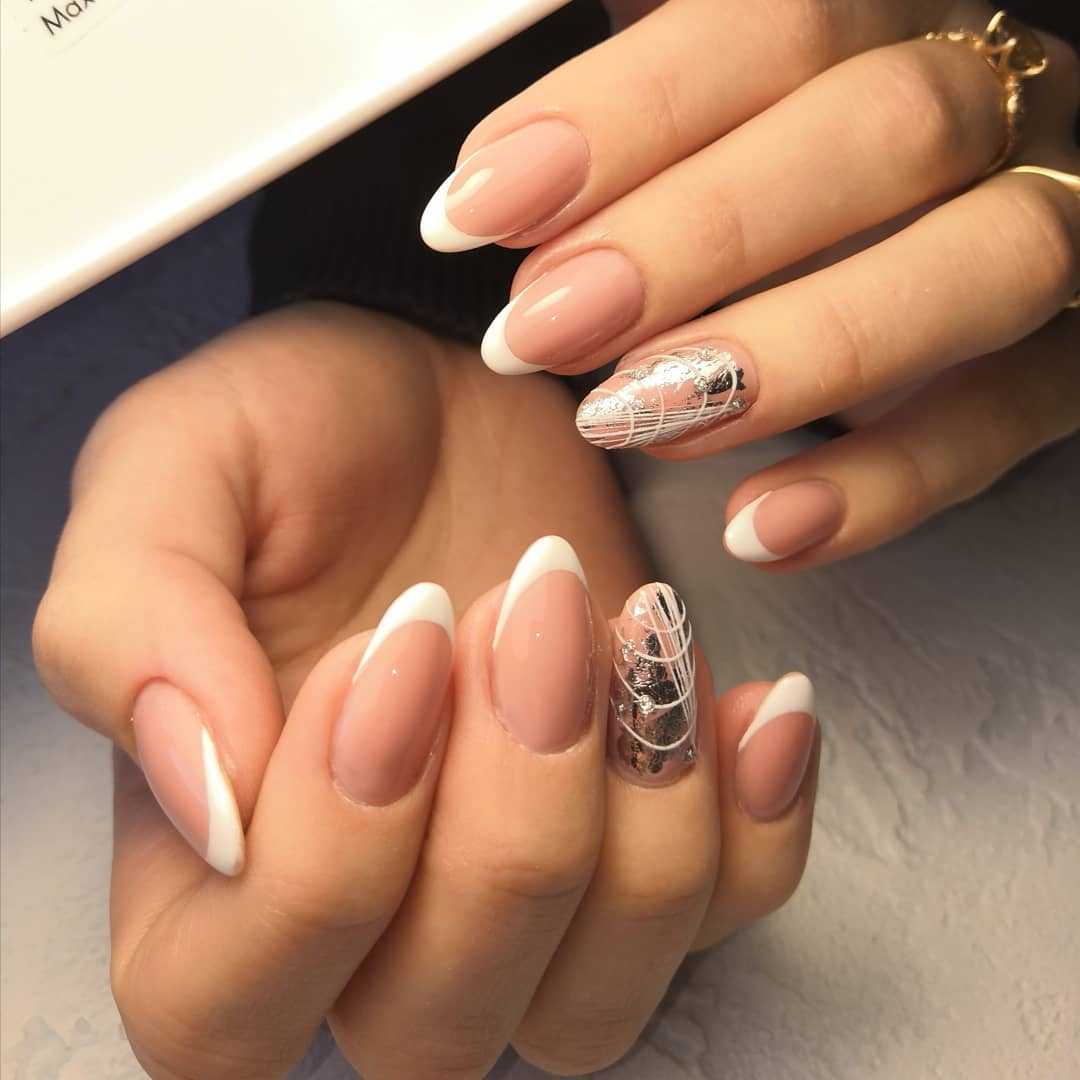 Для коротких миндалевидных ногтей выбирать дизайн френча следует аккуратно. При такой форме есть риск визуально укоротить пальцы. По этой причине в процессе создания дизайна необходимо: