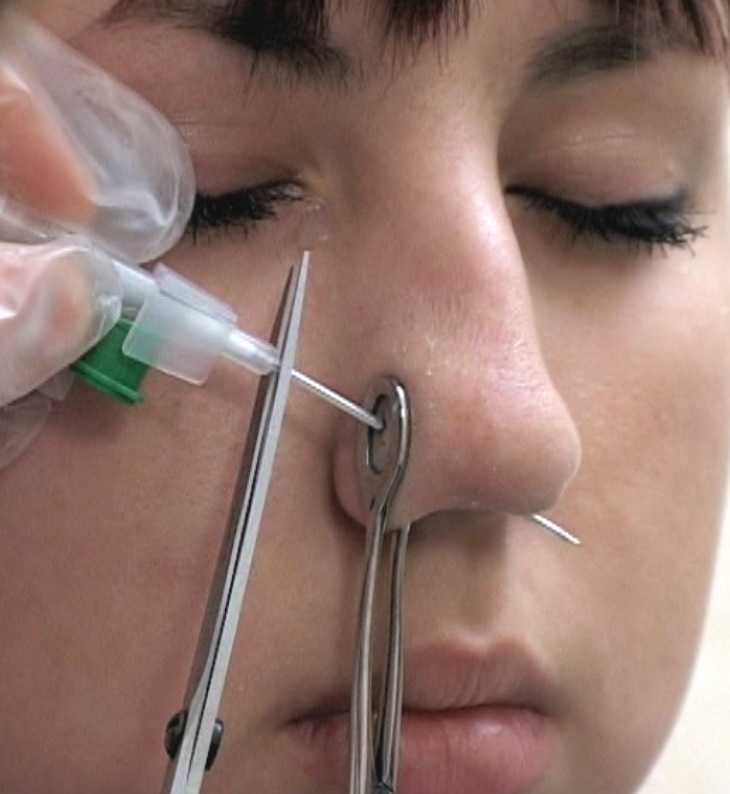 В салоне или клинике процедура проводится с помощью специального зажима с отверстием под прокол, который делается особой иглой для пирсинга. Ни о каких домашних инструментах в этом случае не может быть и речи. Неудавшийся прокол придётся зарастить и колоть заново после полного заживления, поэтому процедура довольно ответственная, и подойти к ней нужно со всей серьёзностью.