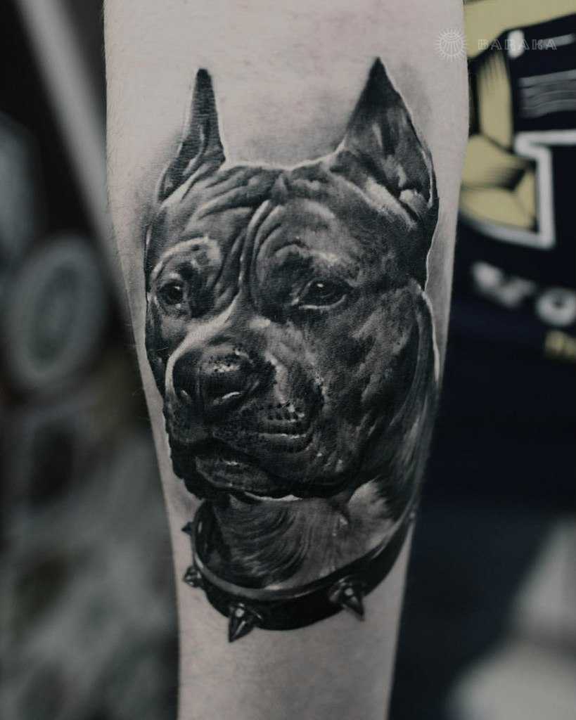 – обладатели таких татуировок должны обладать физической и моральной силой. Некоторые выбирают такую породу для татуировки, потому что являются владельцами таких собак. Чаще всего изображают голову питбуля, однако иногда набивают татуировку с собакой, изображённой в полный рост. Бывает, что питбуль изображён на тату в мультяшном стиле, такая татуировка обозначает доброту, искренность и любовь к животным её владельца, . -