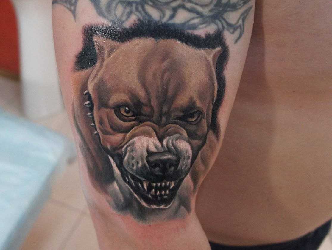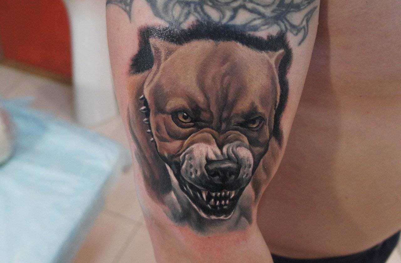 Выбор места для нанесения тату зависит от размеров и формы рисунка. Морду крупной бойцовской собаки бьют на руке в районе предплечья и бицепса. Для них так же предназначаются лопатка, бедро и грудь.