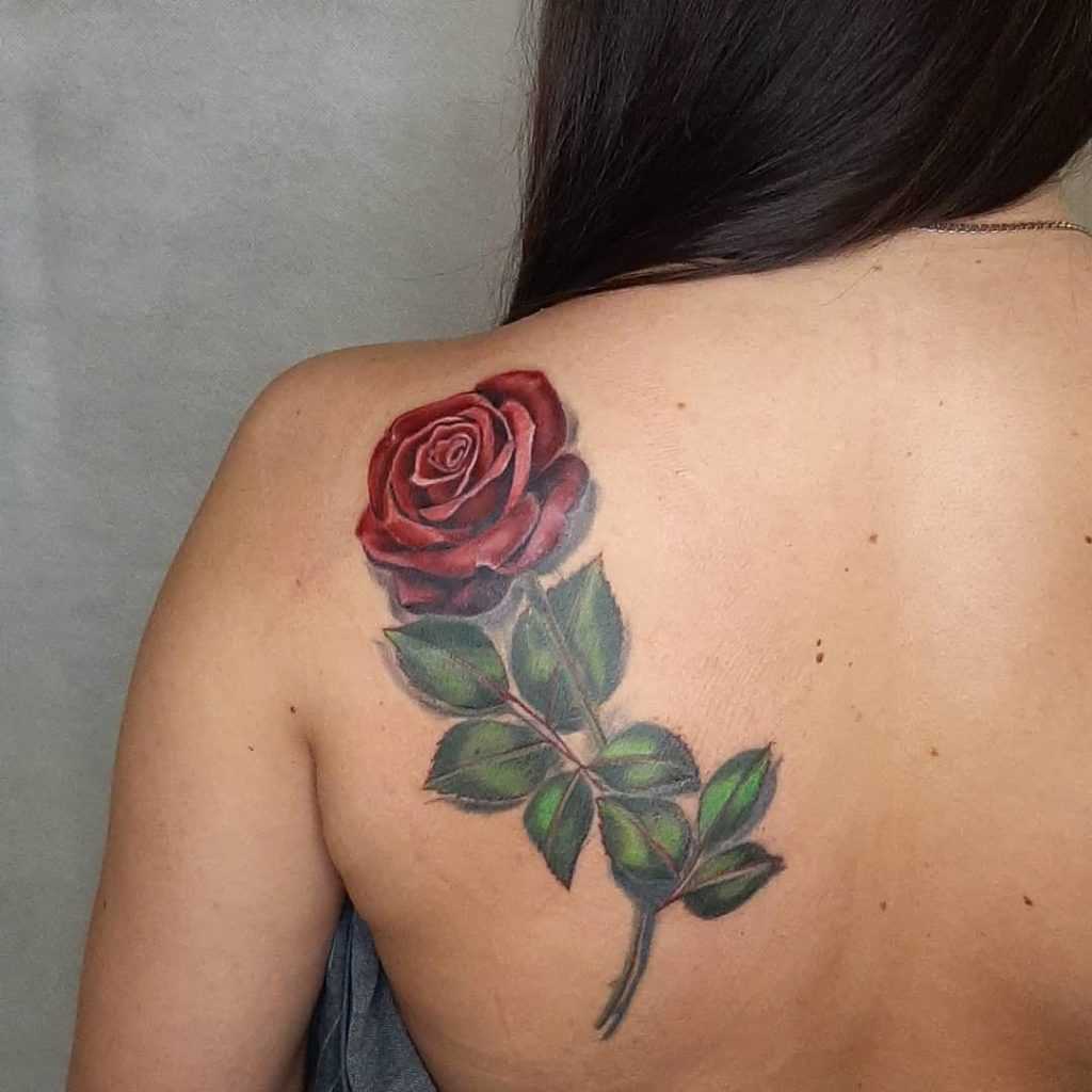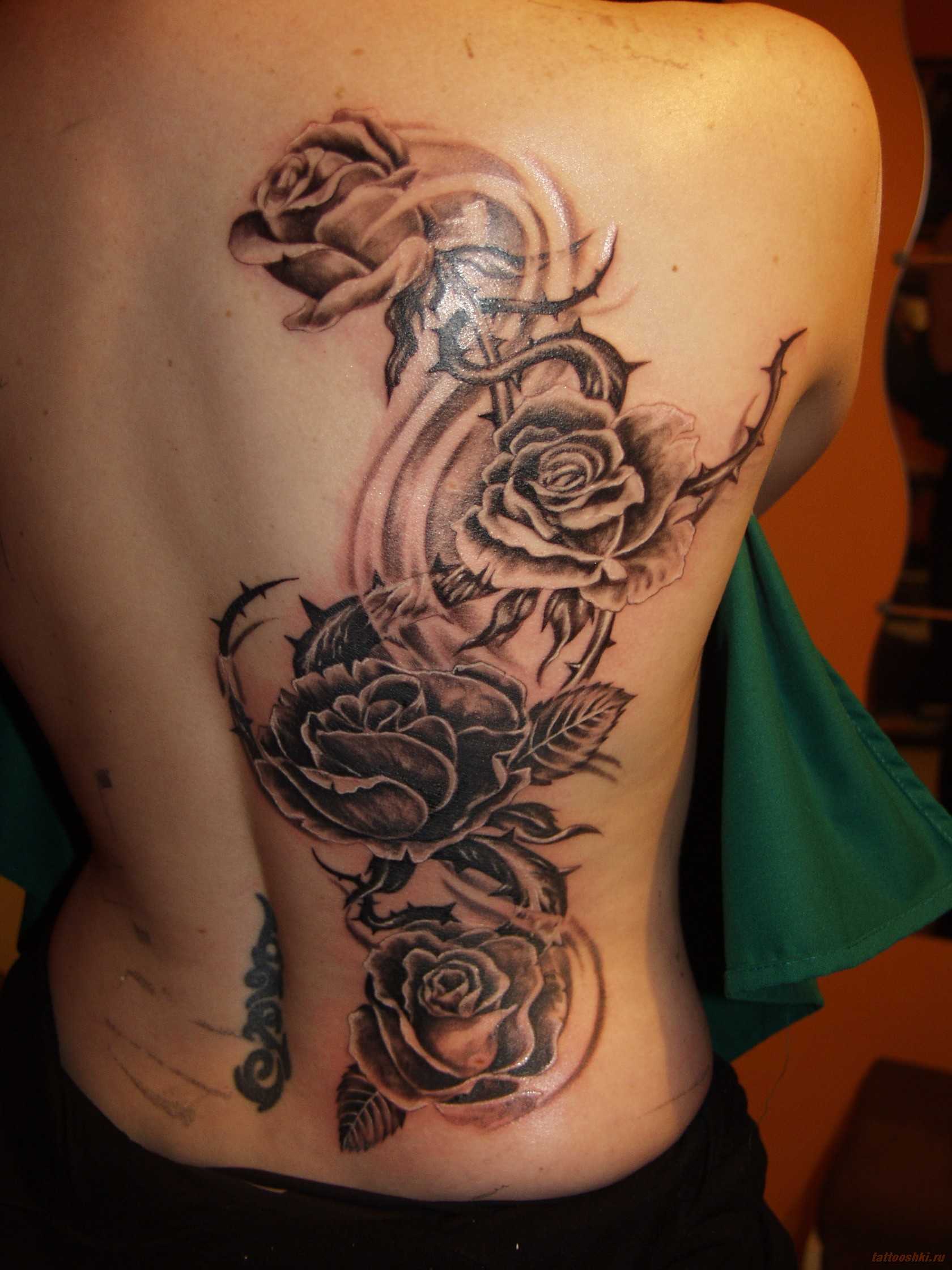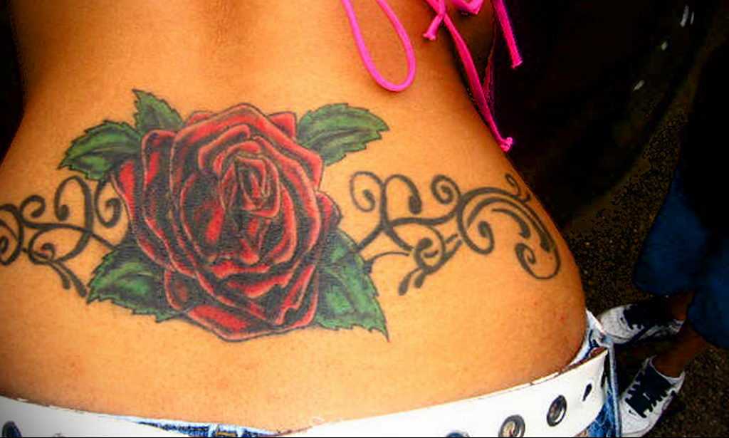 Татуировка роза без шипов на спине, на плече или на руке девушки означает, что она любит кого-то, пылко и по-настоящему. Если же все-таки присутствуют шипы, это говорит о том, что это чувство приносит ей страдание или оно не взаимно.