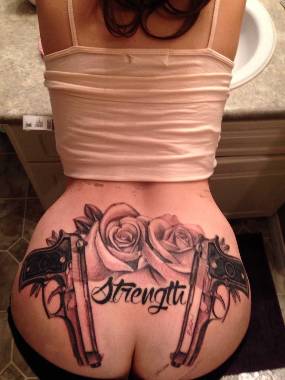 В случае с татуировками на женских ягодицах используют надписи на различных иностранных языках, особенно в сочетании с определенным рисунком (либо они являются частью композиции)