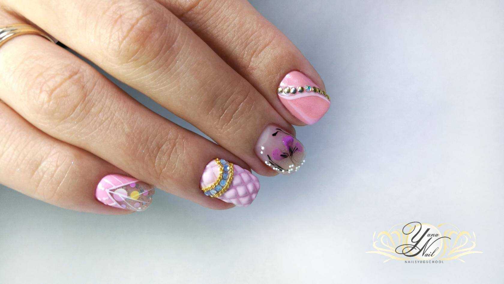 Здесь мы можем говорить как о цветном оформлении (все ногти окрашиваются в разные тона), так и о красочных рисунках на розовом фоне. Чтобы не допустить пестроты и чрезмерной яркости, мастера рекомендуют оформлять декоративные элементы на спокойных розовых оттенках либо не использовать украшения на всех ногтях.