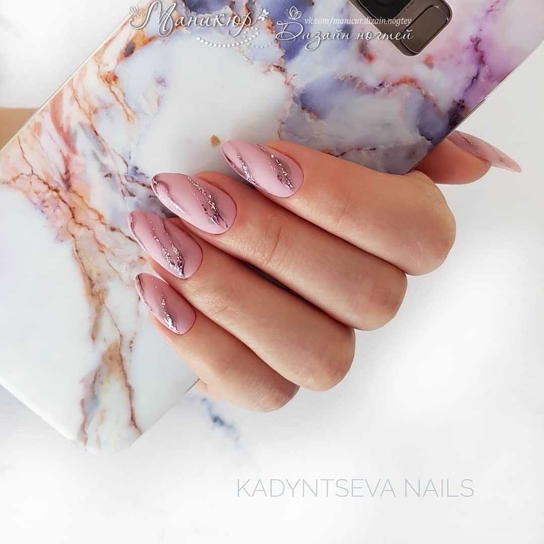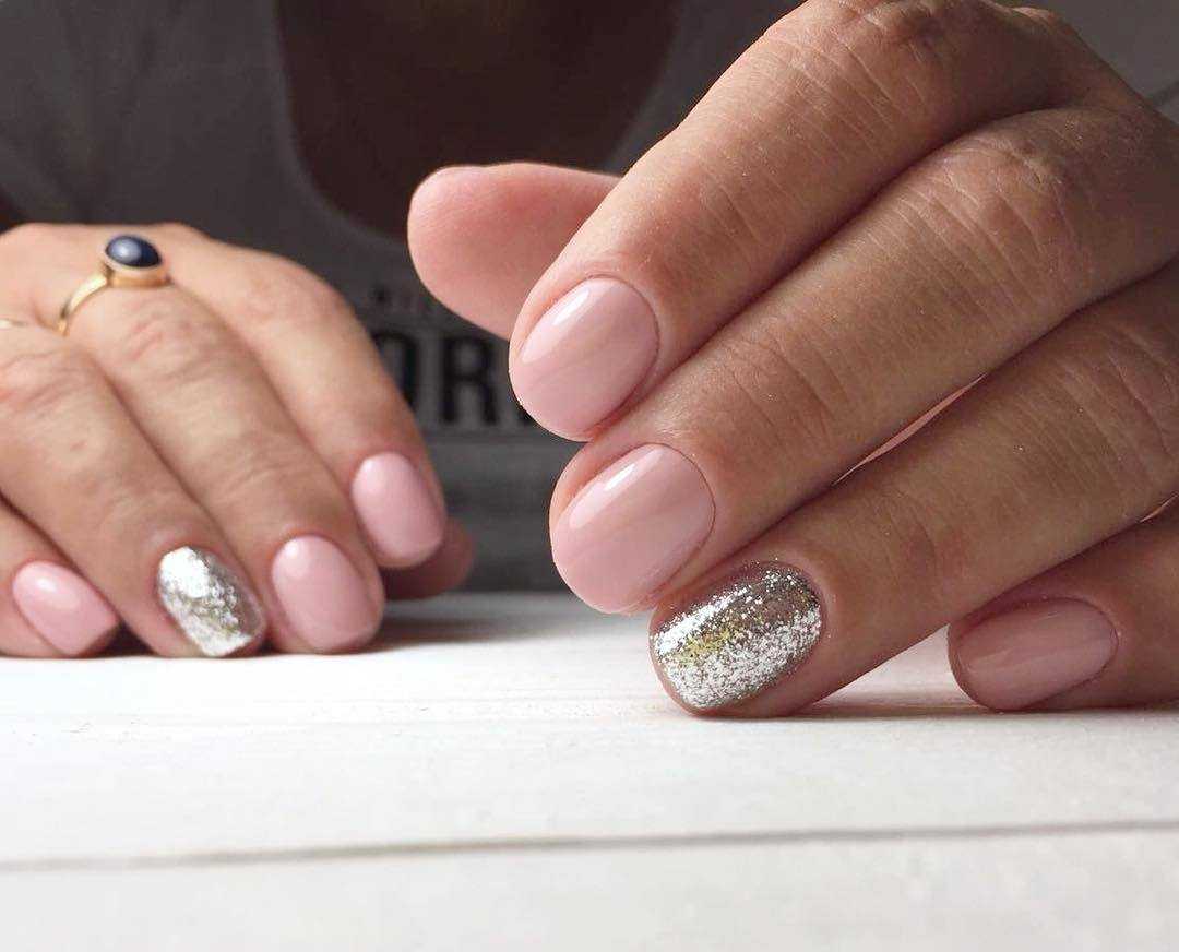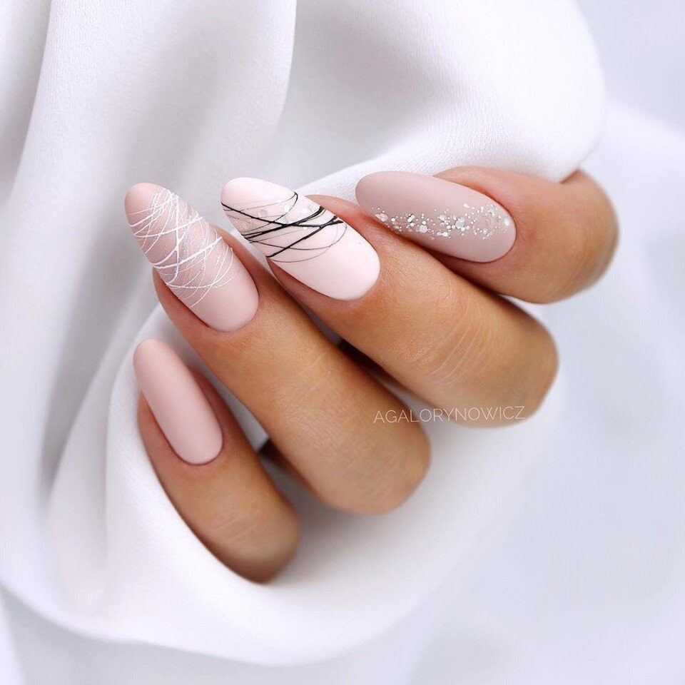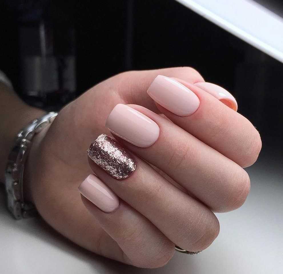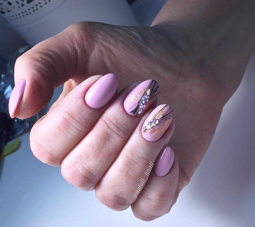Оптимальная возможность добавить оригинальности в маникюр — выполнить на одной руке однотонное нежное розовое покрытие, а на другой дизайн. Красивый дополнительный бежевый оттенок, а также легкие узоры и аккуратный декор с серебром/позолотой, которые встречаются часто в идеях маникюра для офиса, делают дизайн элегантным и утонченным.