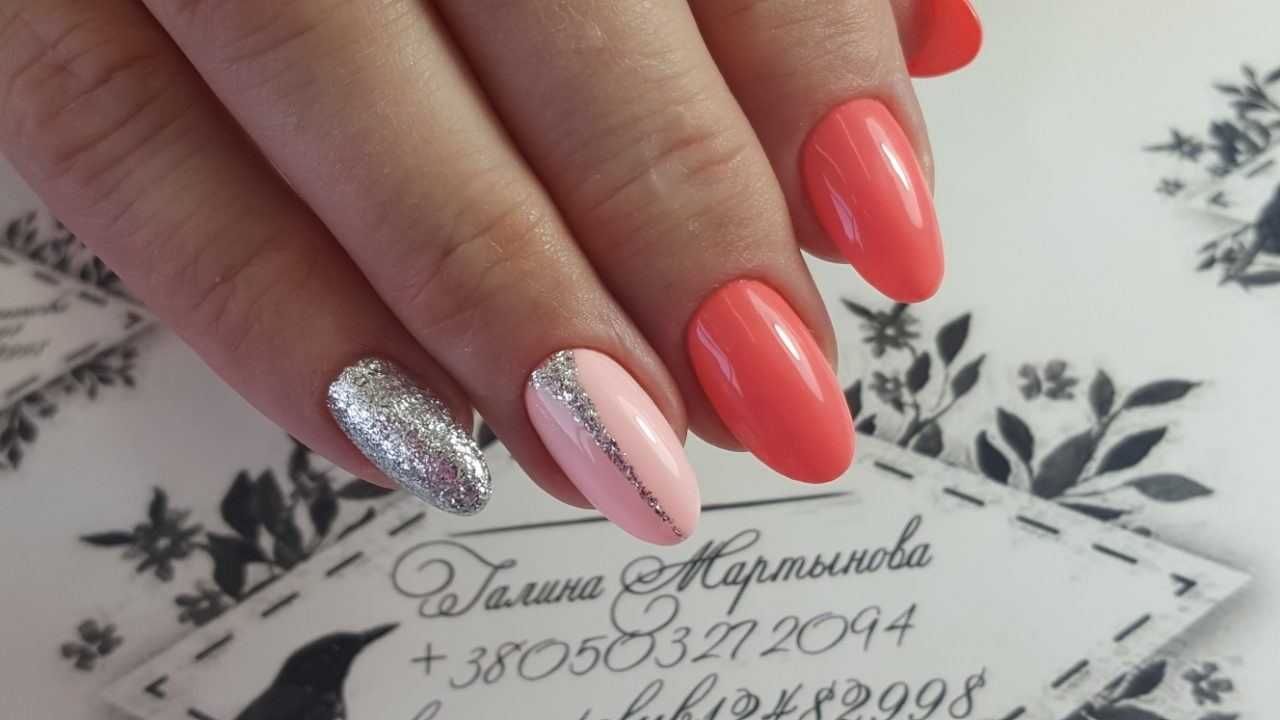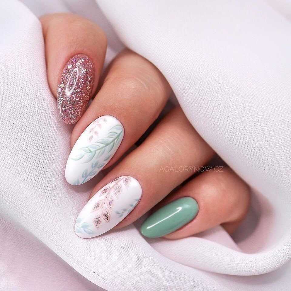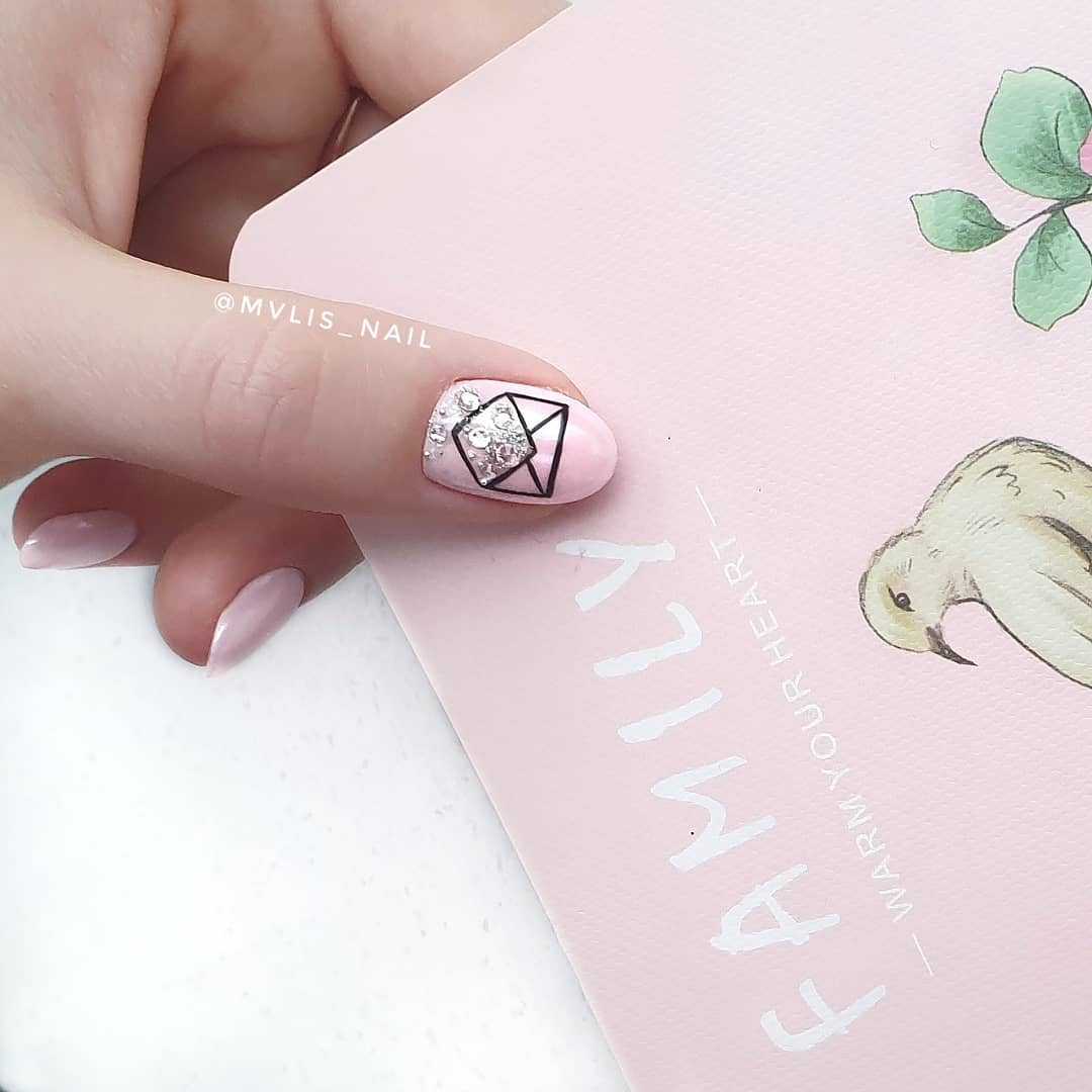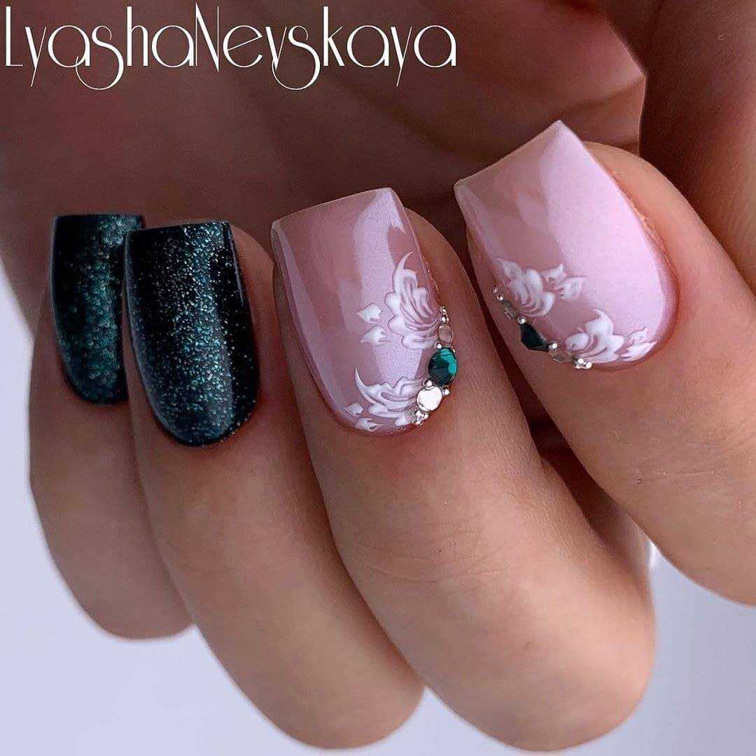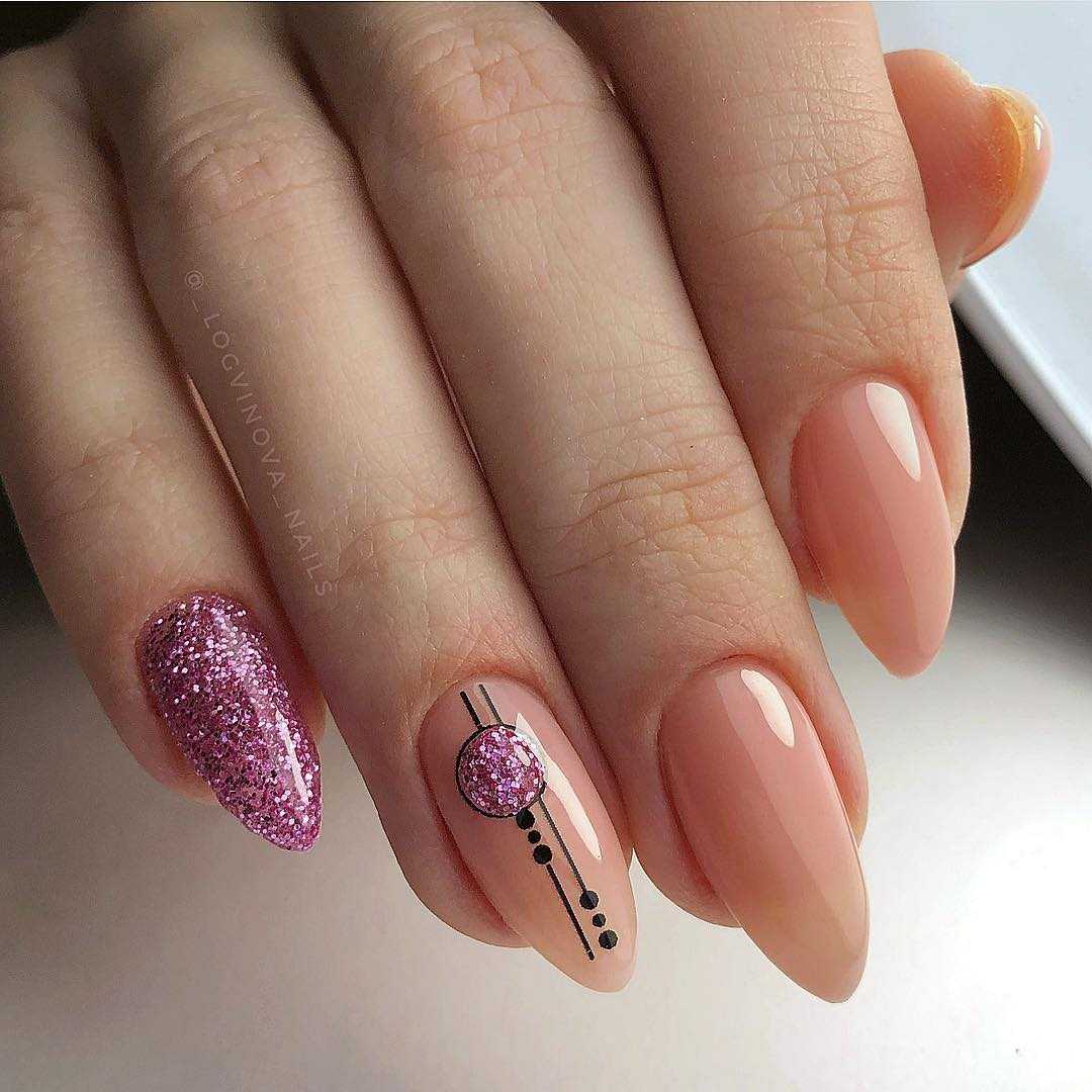 Оптимальная возможность добавить оригинальности в маникюр — выполнить на одной руке однотонное нежное розовое покрытие, а на другой дизайн. Красивый дополнительный бежевый оттенок, а также легкие узоры и аккуратный декор с серебром/позолотой, которые встречаются часто в идеях маникюра для офиса, делают дизайн элегантным и утонченным.