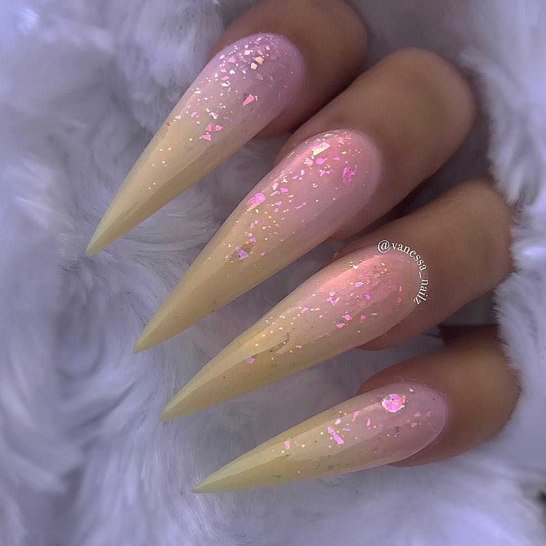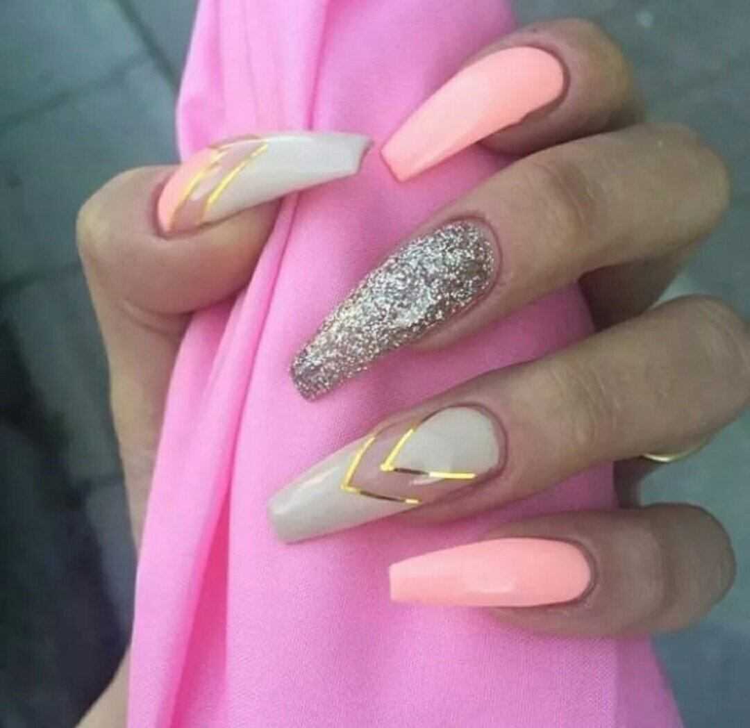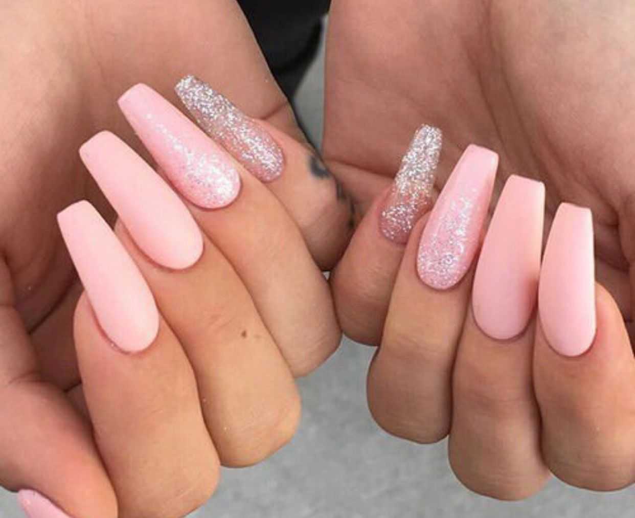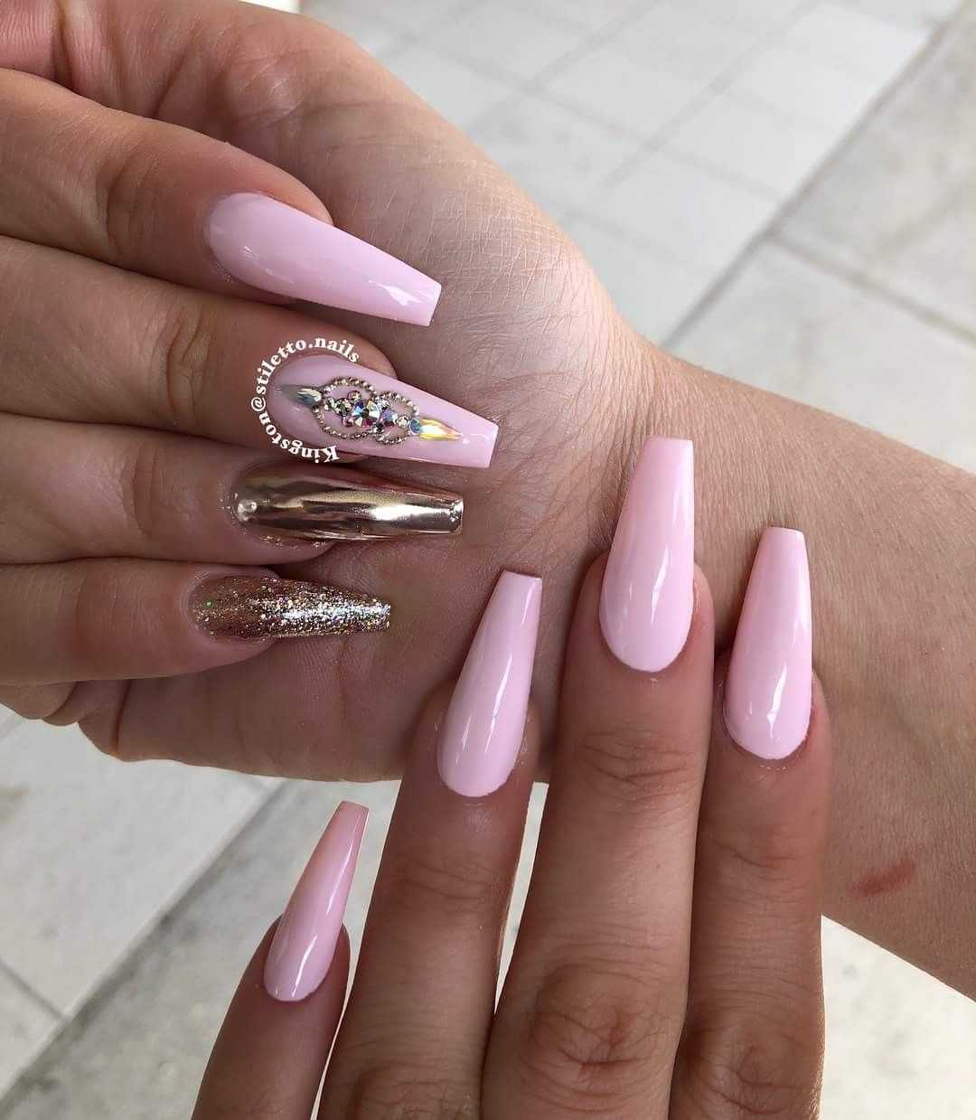 При выполнении маникюра на длинных ноготках всегда можно пофантазировать и воплотить в реальность самые невероятные идеи. При помощи различных блёсток можно создавать на ногтевых пластинах интересные узоры или выделять сиянием лишь часть ногтя. Френч, лунный дизайн и многие другие идеи являются в этом случае наглядным примером. Розовый маникюр с блёстками допускает использование как ярких, так и сдержанных оттенков, а также серого, белого или чёрного лака. Помимо блестящих дополнений также приветствуются рисунки, объёмные детали и комбинирование нескольких техник.